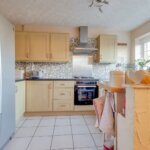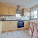 Double glazed window to rear. Range of base and wall mounted units providing drawer and cupboard space with work top surface extending to incorporate inset sink unit with cupboard beneath. Recess for fridge freezer and washing machine. Built in oven, hob and extractor fan above (all untested). Tiling to floor.