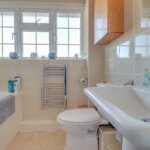 Double glazed opaque window to rear. Suite comprising of low level WC, pedestal wash hand basin and panel enclosed bath unit with shower (untested) and screen. Radiator/rail (untested). Vanity cupboard.