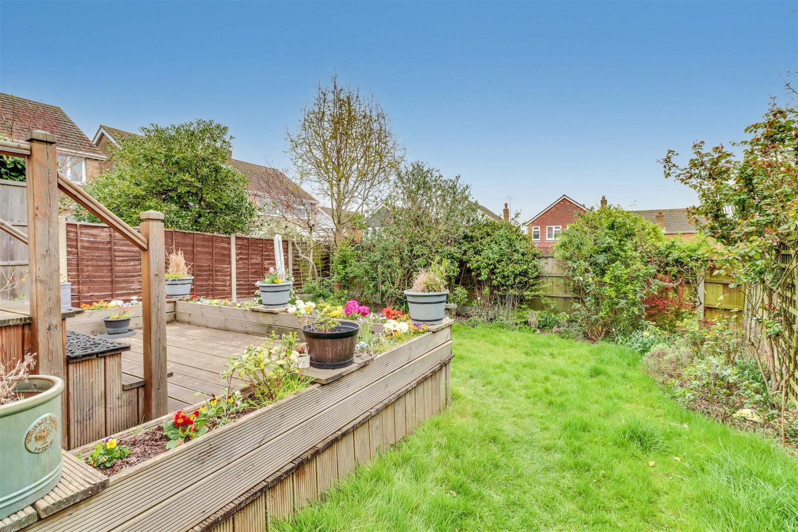 Commencing with decking to immediate rear with remainder laid to lawn with flower and shrub borders. Fencing to side and rear boundaries. Block paved path with gates to both sides. Outside tap (untested).