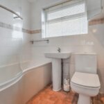 Double glazed opaque window to side. Suite comprising of low level WC, wash hand basin and panel enclosed bath unit with shower attachment (untested) and screen. Extensive tiled surround. Coved ceiling. Extractor fan (untested).