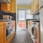 Double glazed window and double glazed door to side. Range of base and wall mounted units providing drawer and cupboard space with work top surface extending to incorporate inset sink unit with cupboard beneath. Recess for fridge freezer and washing machine. Built in oven, hob and extractor fan above (all untested). Cupboard housing gas fired boiler (untested).