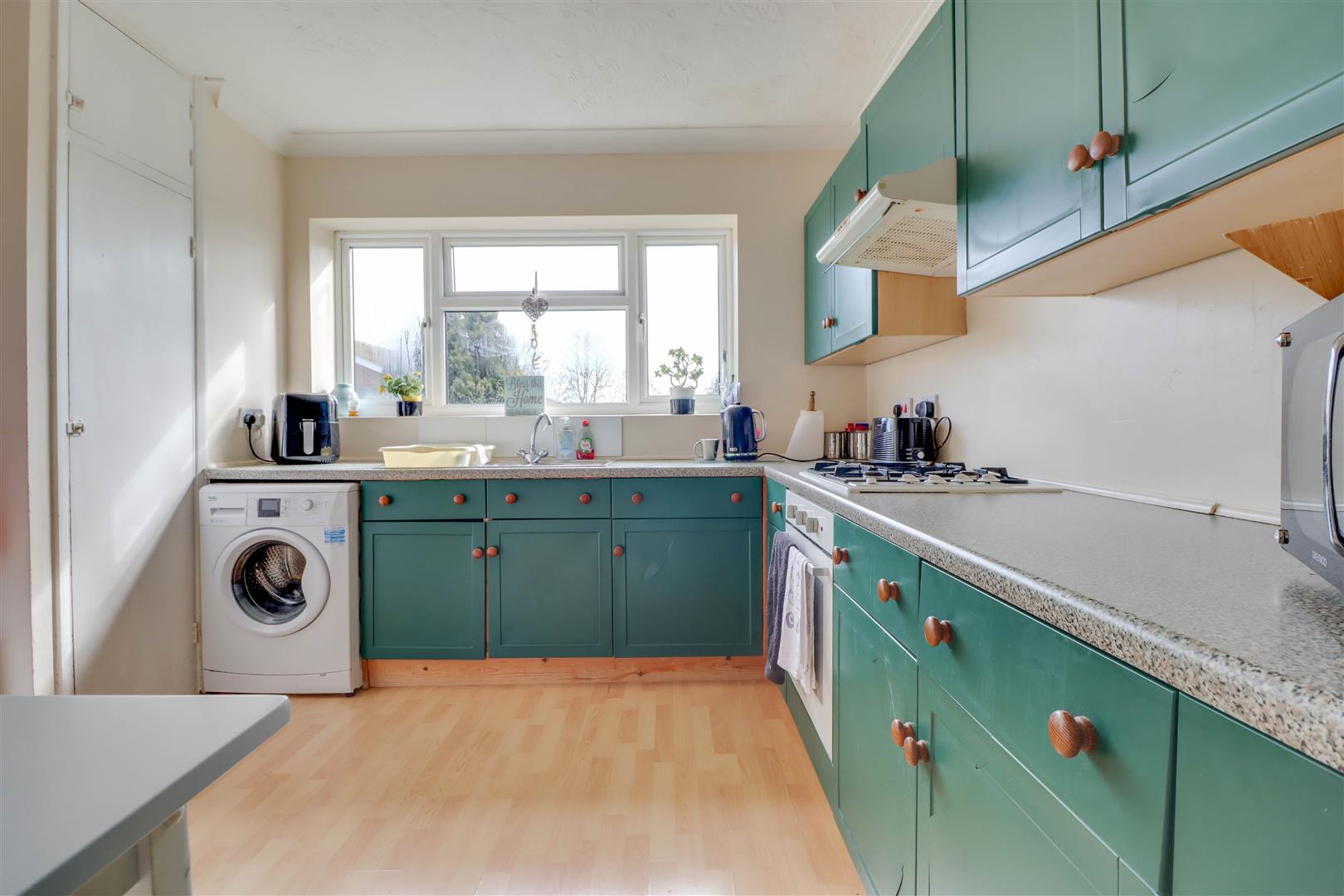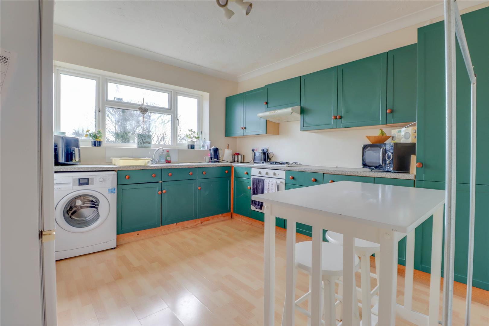Double glazed window to rear. Radiator (untested). Range of base and wall mounted units providing drawer and cupboard space with work top surface extending to incorporate inset sink unit with cupboard beneath. Recess for washing machine and fridge freezer. Built in oven and hob (all untested). Cupboard housing gas fired boiler and meter).