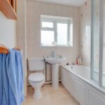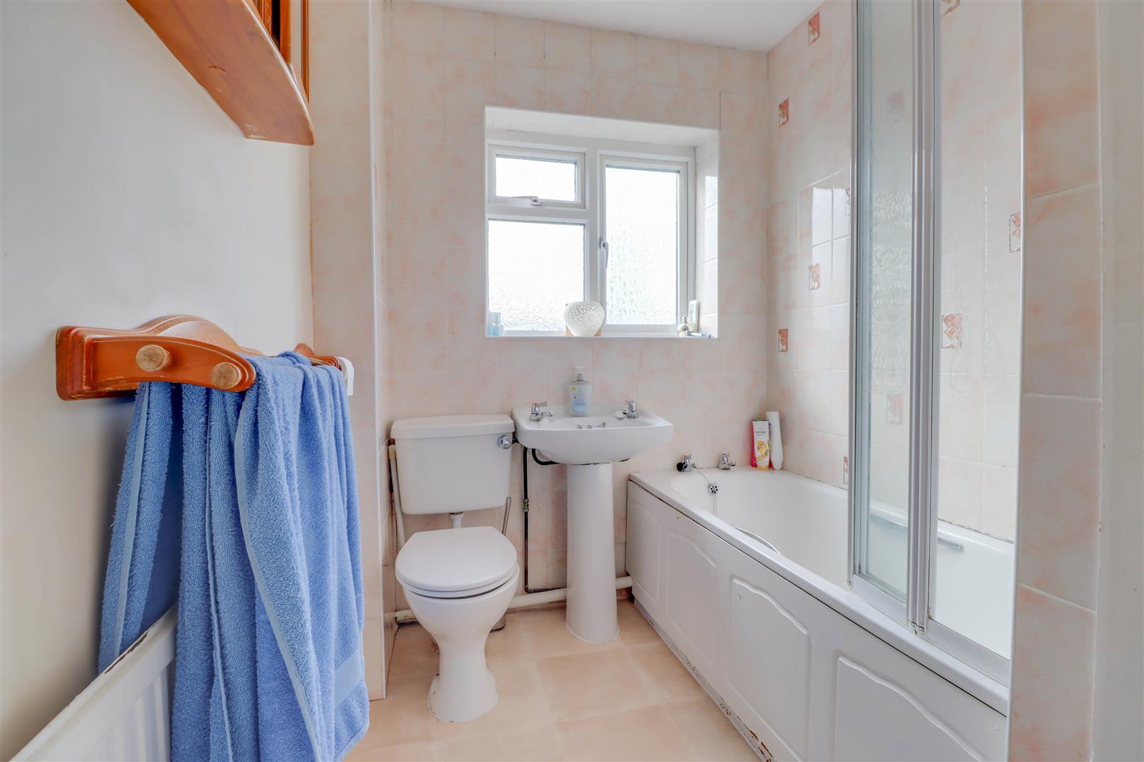 Double glazed opauqe window to side. Suite comprising of low level WC, wash hand basin and panel enclosed bath unit with shower (untested) and screen. Radiator (untested). Tiled surround. Airing cupboard.