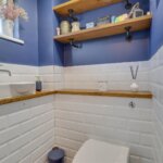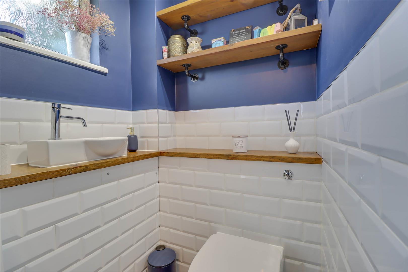 Suite comprising of enclosed low level WC and wash hand basin. Part tiled walls. Laminate finish to floor. Radiator (untested).