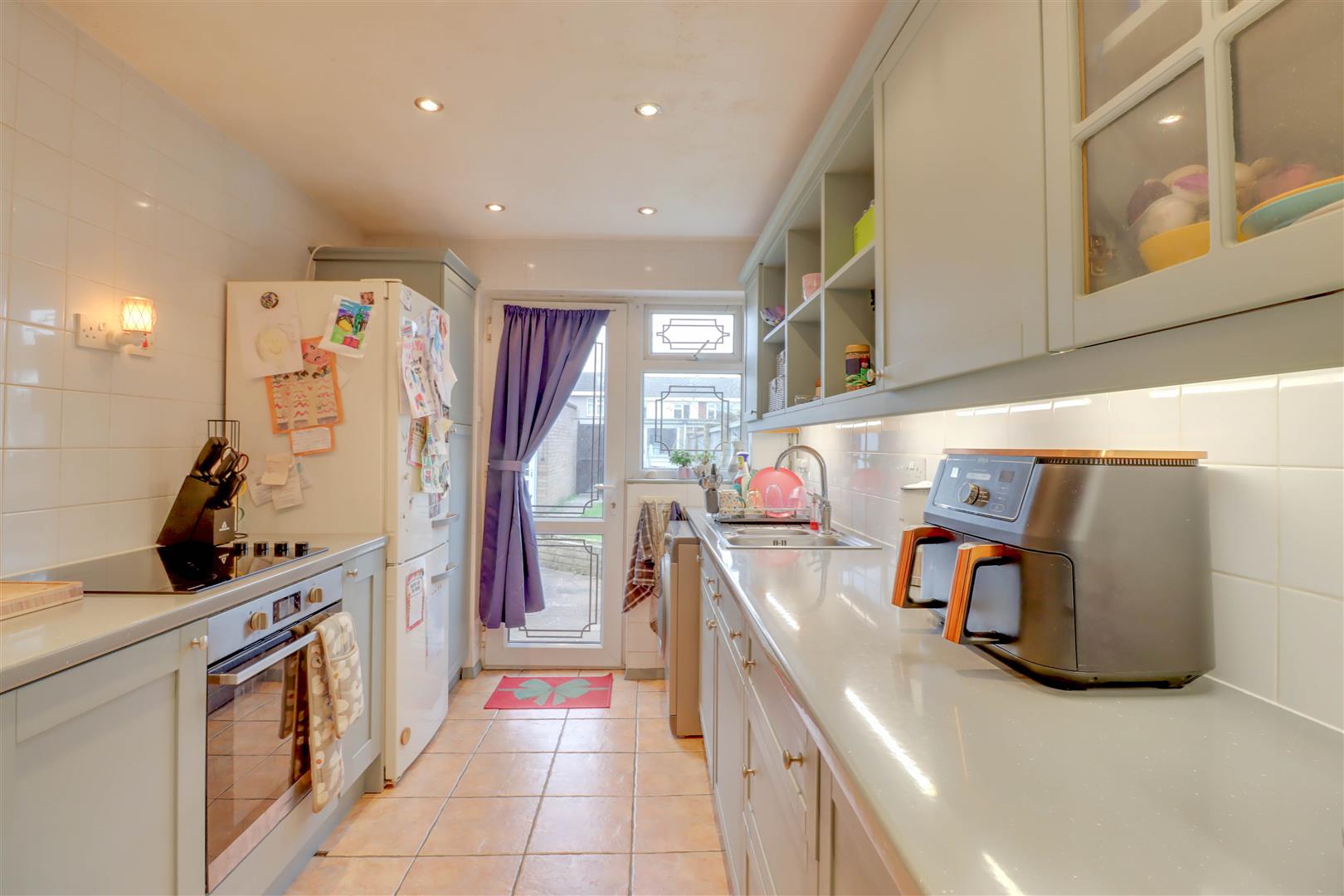 Double glazed door and double glazed window to rear. Range of base and wall mounted units providing drawer and cupboard space with work top surface extending to incorporate inset sink unit with cupboard beneath. Built in oven and hob (all untested). Fridge freezer to remain (untested). Space for appliances. Part tiling to walls.