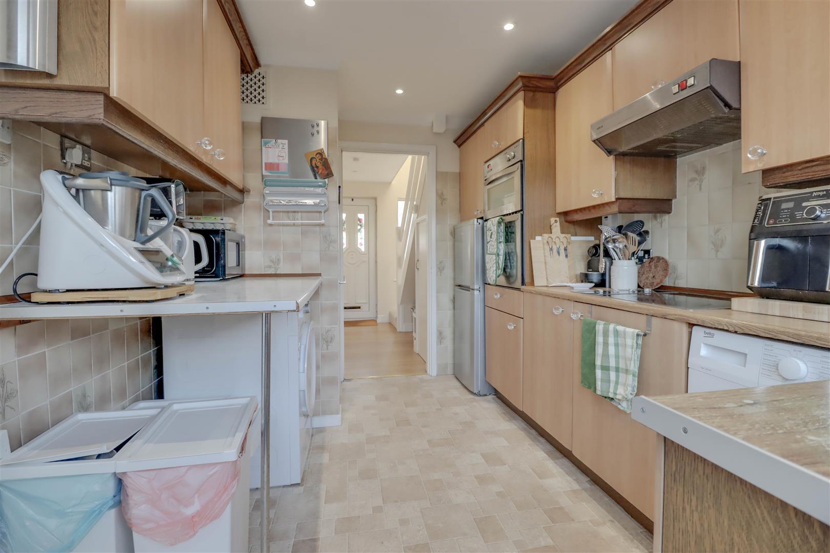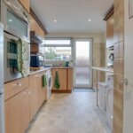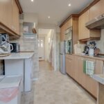 Double glazed window and door to rear. Range of base and wall mounted units providing drawer and cupboard space with work tops extending to incorporate sink unit. Recess for fridge/freezer and washing machine. Tiled surround.