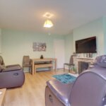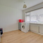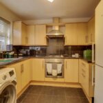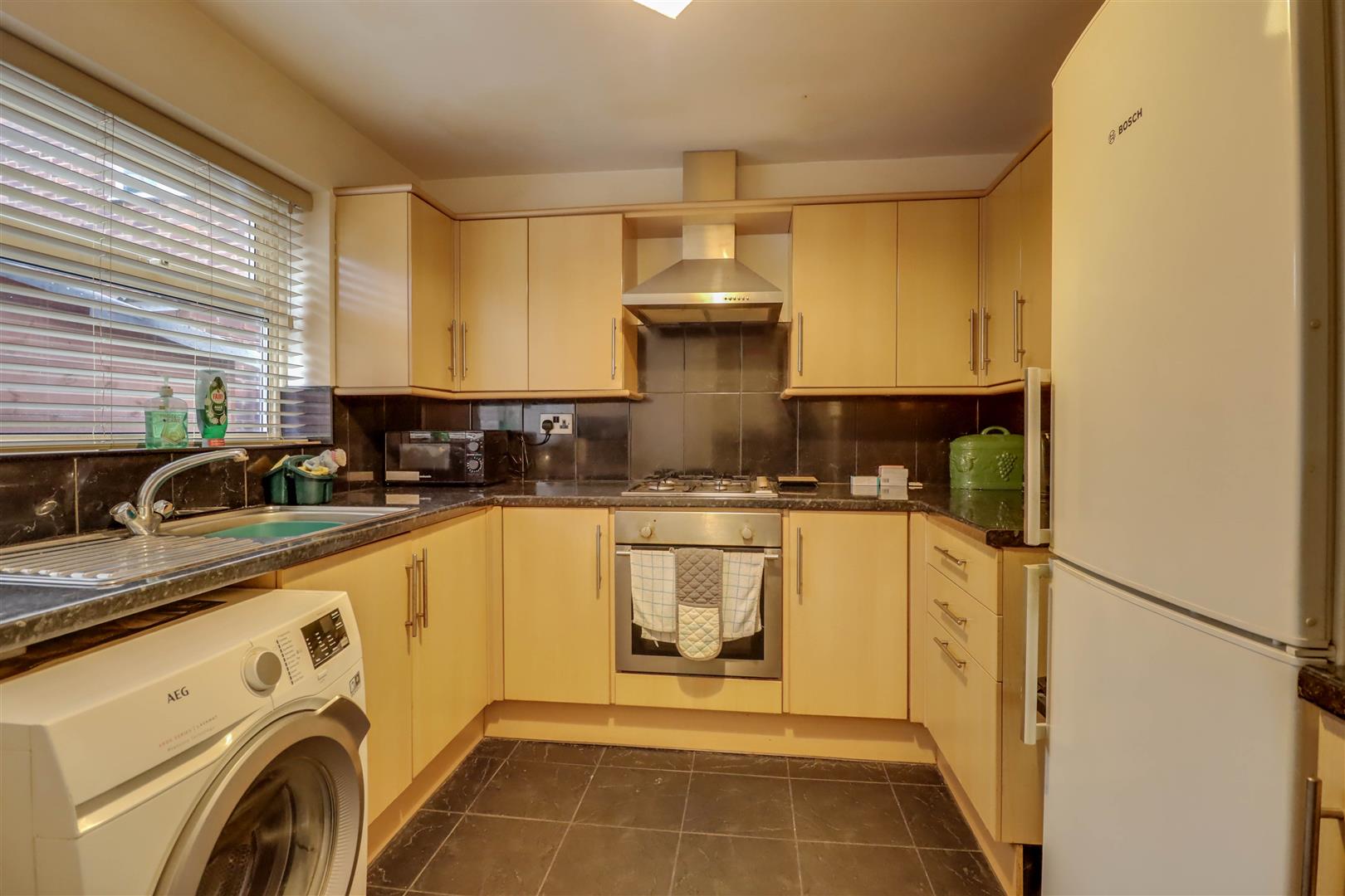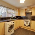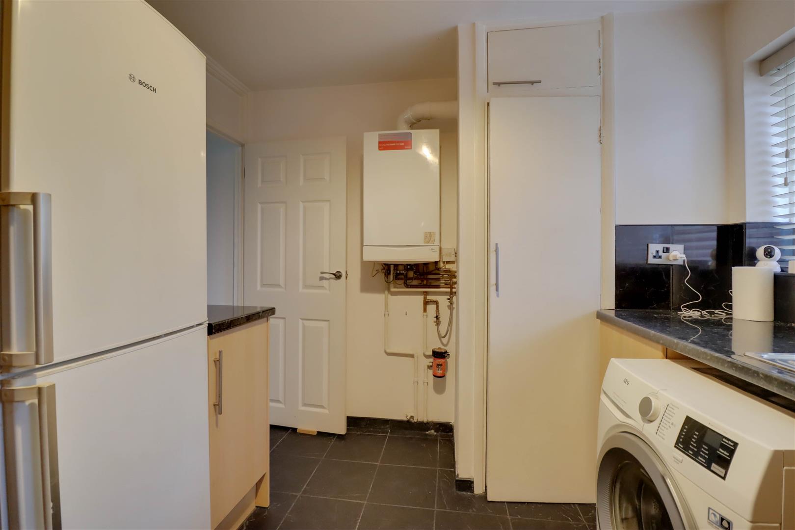 Double glazed window to rear. Range of base and wall mounted units providing drawer and cupboard space with work top surface extending to incorporate inset sink unit with cupboard beneath. Space for washing machine and fridge freezer. Built in oven, hob and extractor fan above. Larder cupboard housing gas fired boiler.