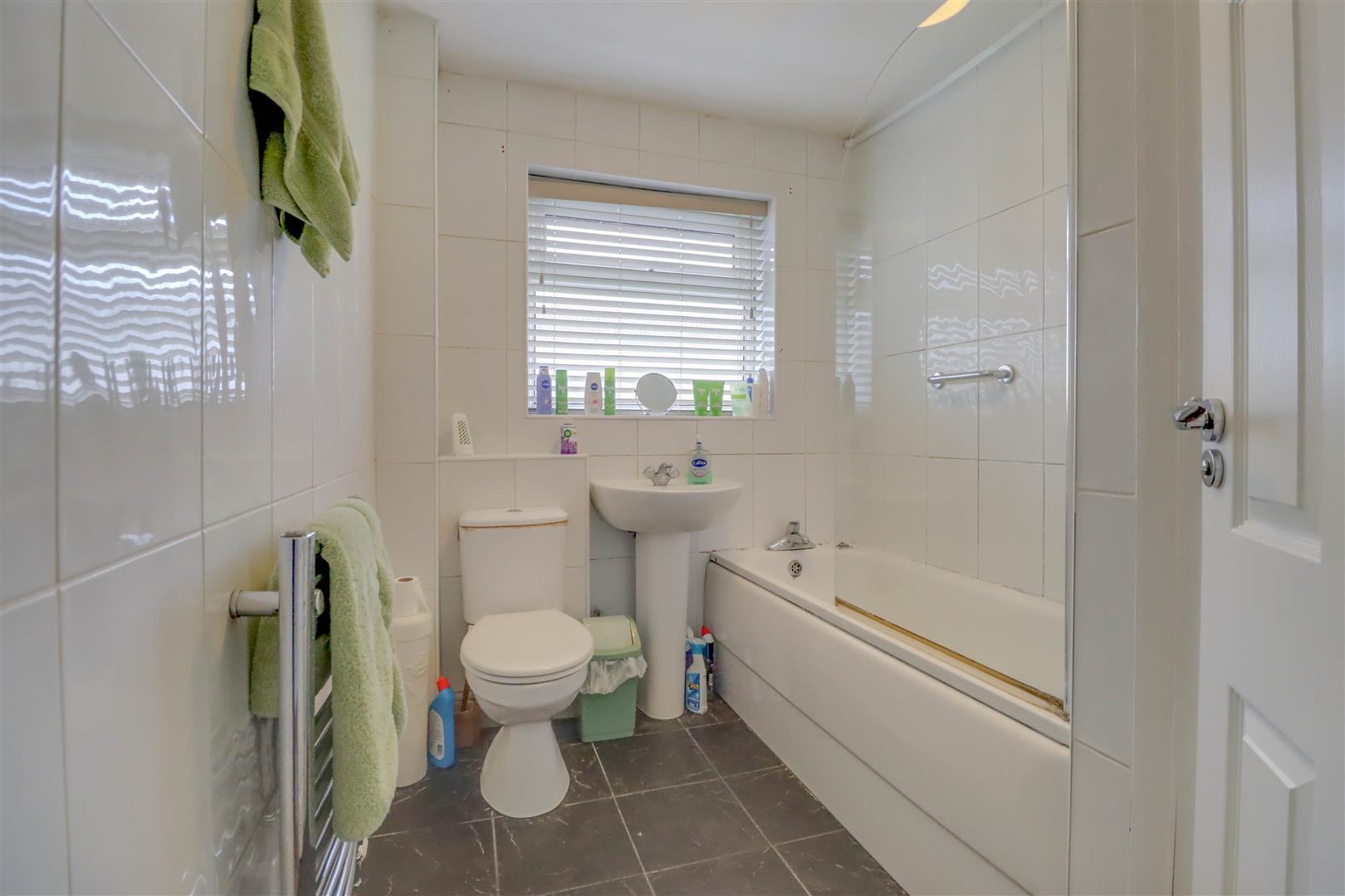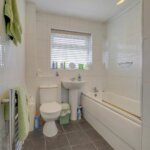 Double glazed opaque window to side. Suite comprising of low level WC, pedestal wash hand basin and panel enclosed bath unit with shower and screen. Radiator/rail. Storage cupboard.