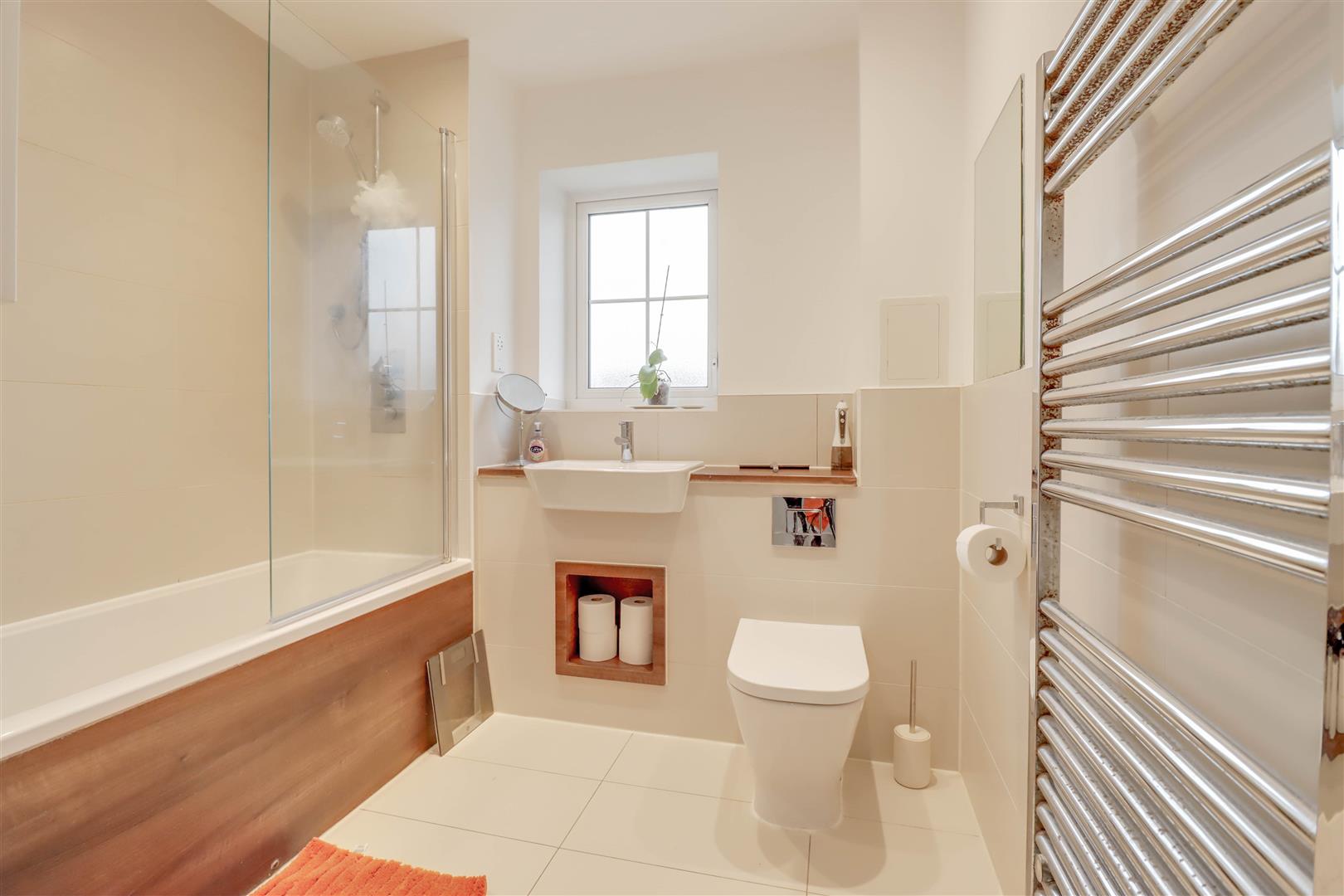 Double glazed opaque window to rear. Suite comprising of low level WC, wash hand basin and panel enclosed bath unit with shower and screen. Extensive tiled surround. Radiator/rail.