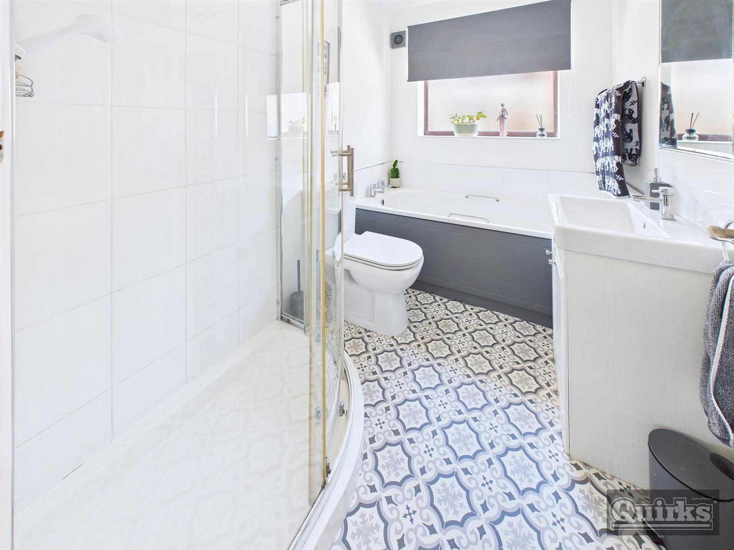 Double glazed window to flank, four piece suite in white comprising panelled bath, separate shower cubicle, low flush wc and wash hand basin inset to vanity unit