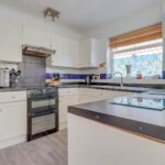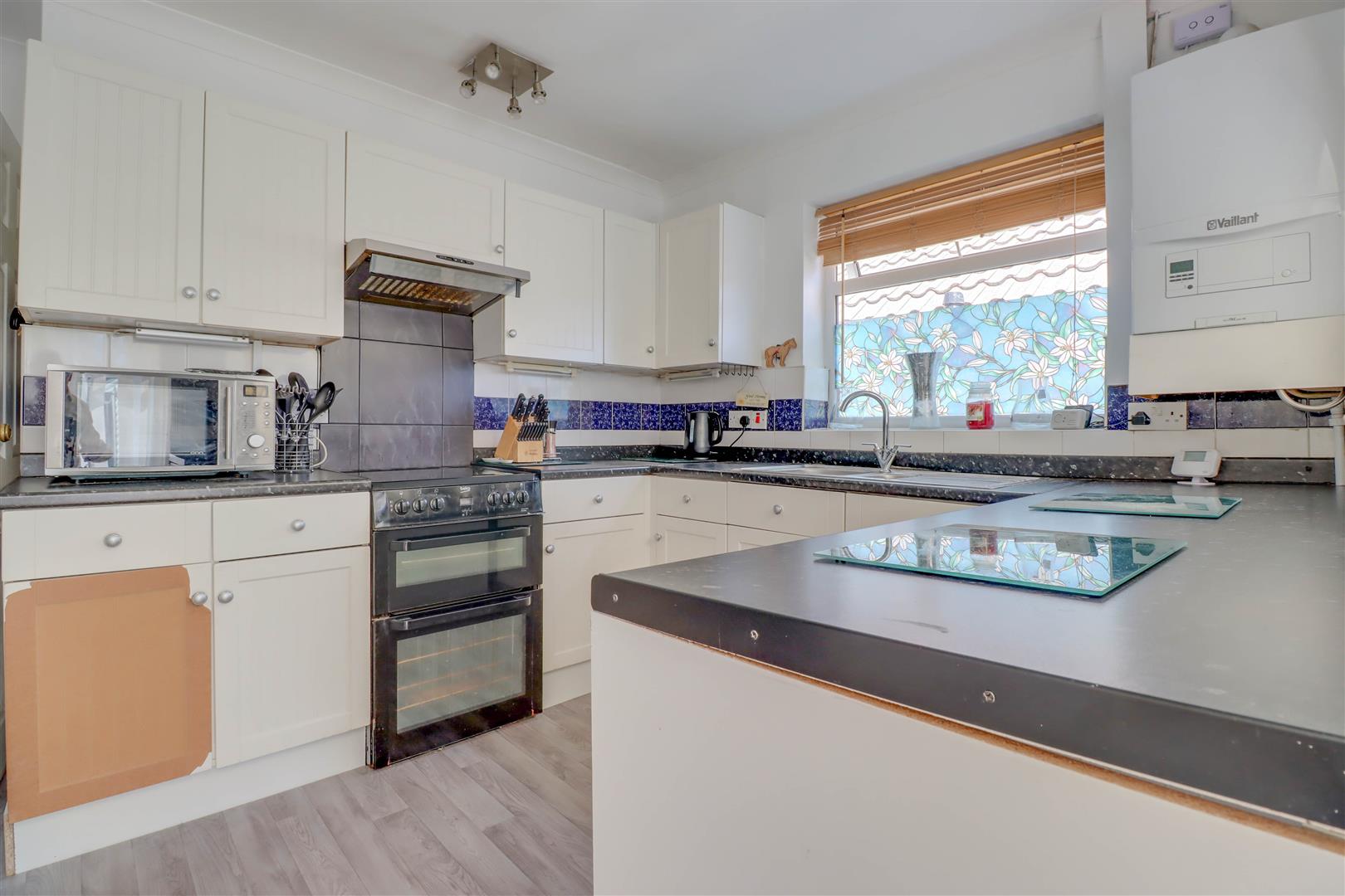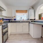 Double glazed window to side. Range of base and wall mounted units providing drawer and cupboard space with work top surface extending to incorporate inset sink unit with cupboard beneath. Recess for dishwasher and cooker. Tiled surround. Radiator. Coved ceiling. Cupboard housing meters.