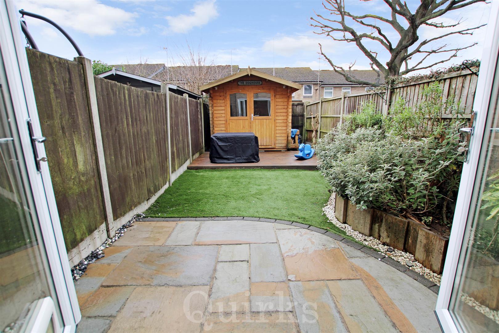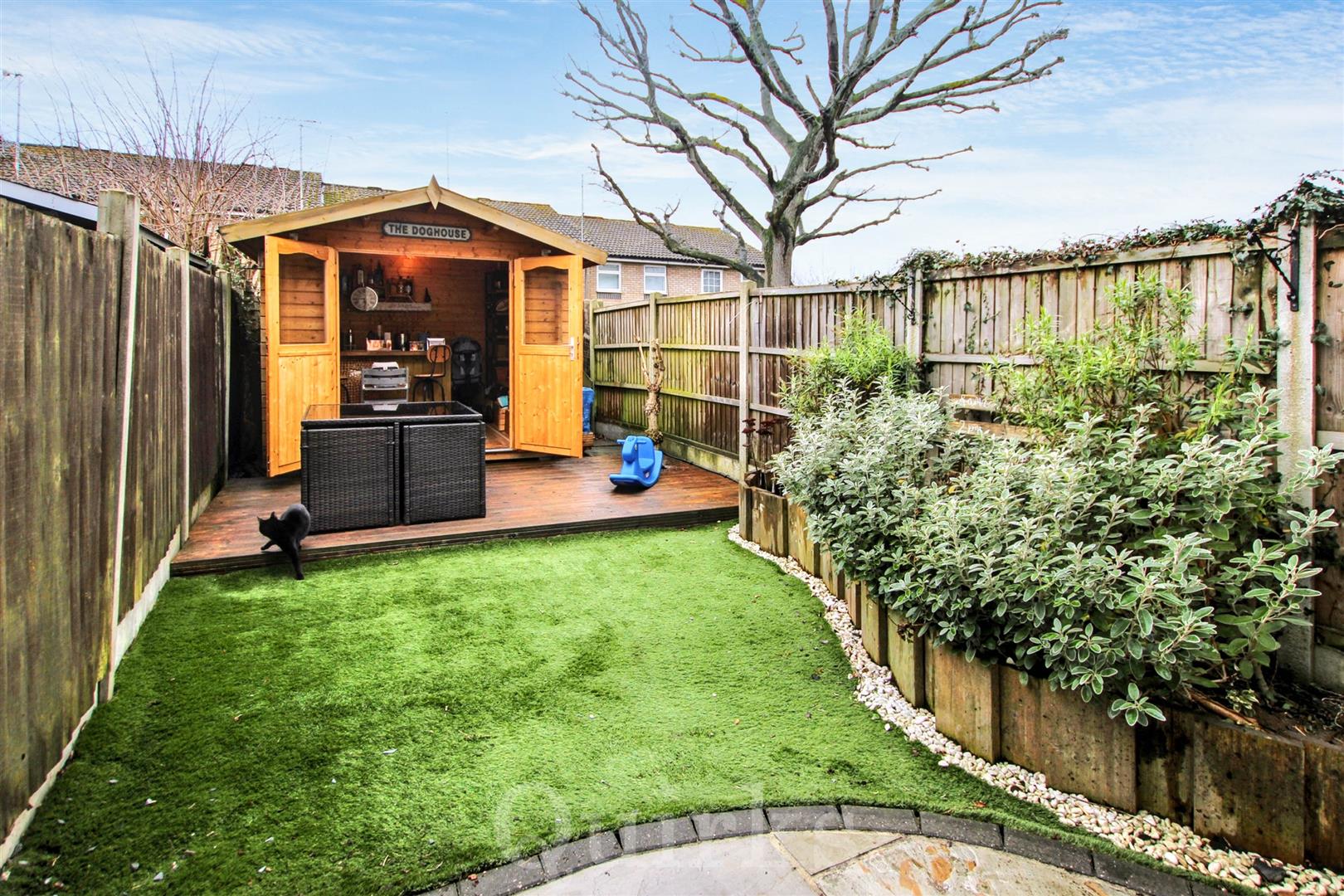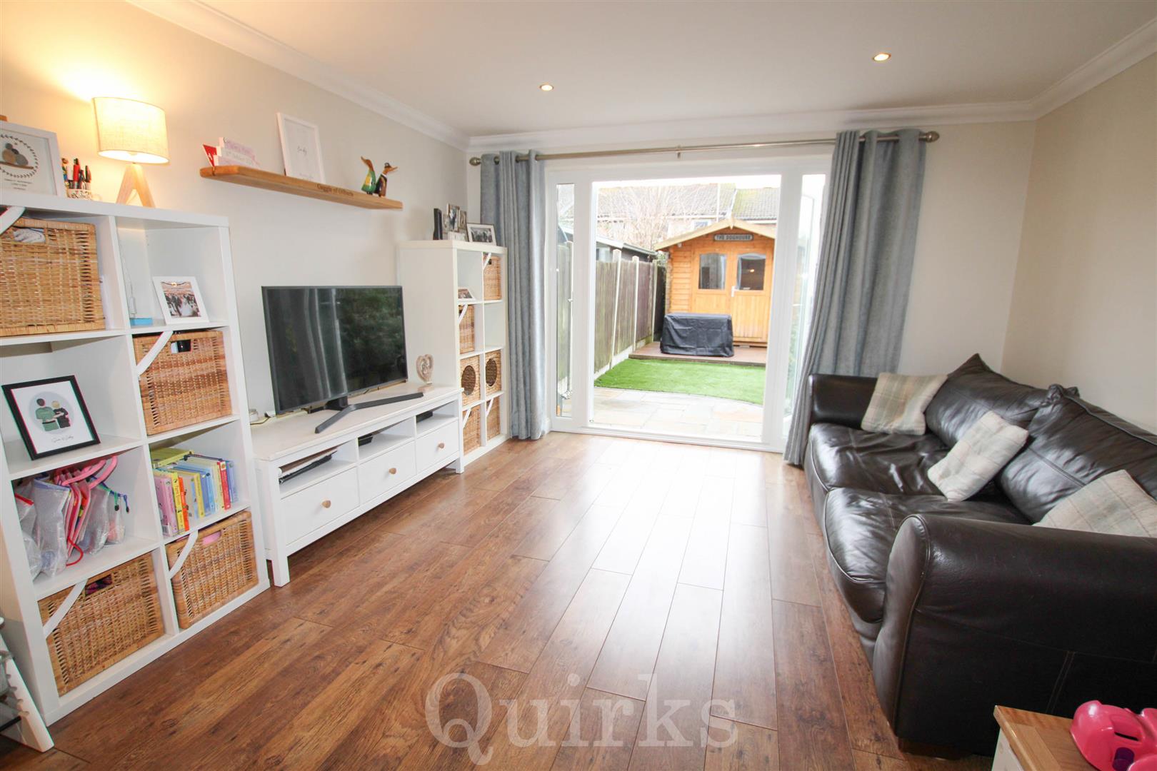 An immaculately presented and modern two bedroom house, ideally suited for first time buyers, investors and downsizers. This property is situated in a popular cul-de-sac, within the Queens Park area of Billericay, just a short walk to The Pantiles Shopping Parade, Lake Meadows Park and Billericay Railway Station. This property is deceptively spacious and includes a sizeable entrance hallway, with plenty of built-in storage, leading to the modern fitted kitchen, which includes an integrated dishwasher, four ring induction hob, oven and microwave, there are spaces for a fridge / freezer and washing machine. The living room has a set of double glazed French doors and matching side windows and access to the under-stairs storage cupboard, a fitted L-shaped corner seat with built-in storage and dining table, to suit the room perfectly. The first floor landing is an excellent size, with access to the loft, housing the ATAG combination gas boiler installed in 2023. The property benefits from two double bedrooms and a refitted, modern bathroom, with a modern white suite including bath with shower above. Externally the property has a fenced bin store to the front of the house, there is allocated parking and garage located nearby to the house. The rear garden is low maintenance with a paved patio area, artificial lawn, raised flower beds and outside power points. To the far end of the garden is a decking area and detached outbuilding, currently arranged as a bar area with power & lighting, which is great for entertaining and BBQ's and could also be converted to a home office.