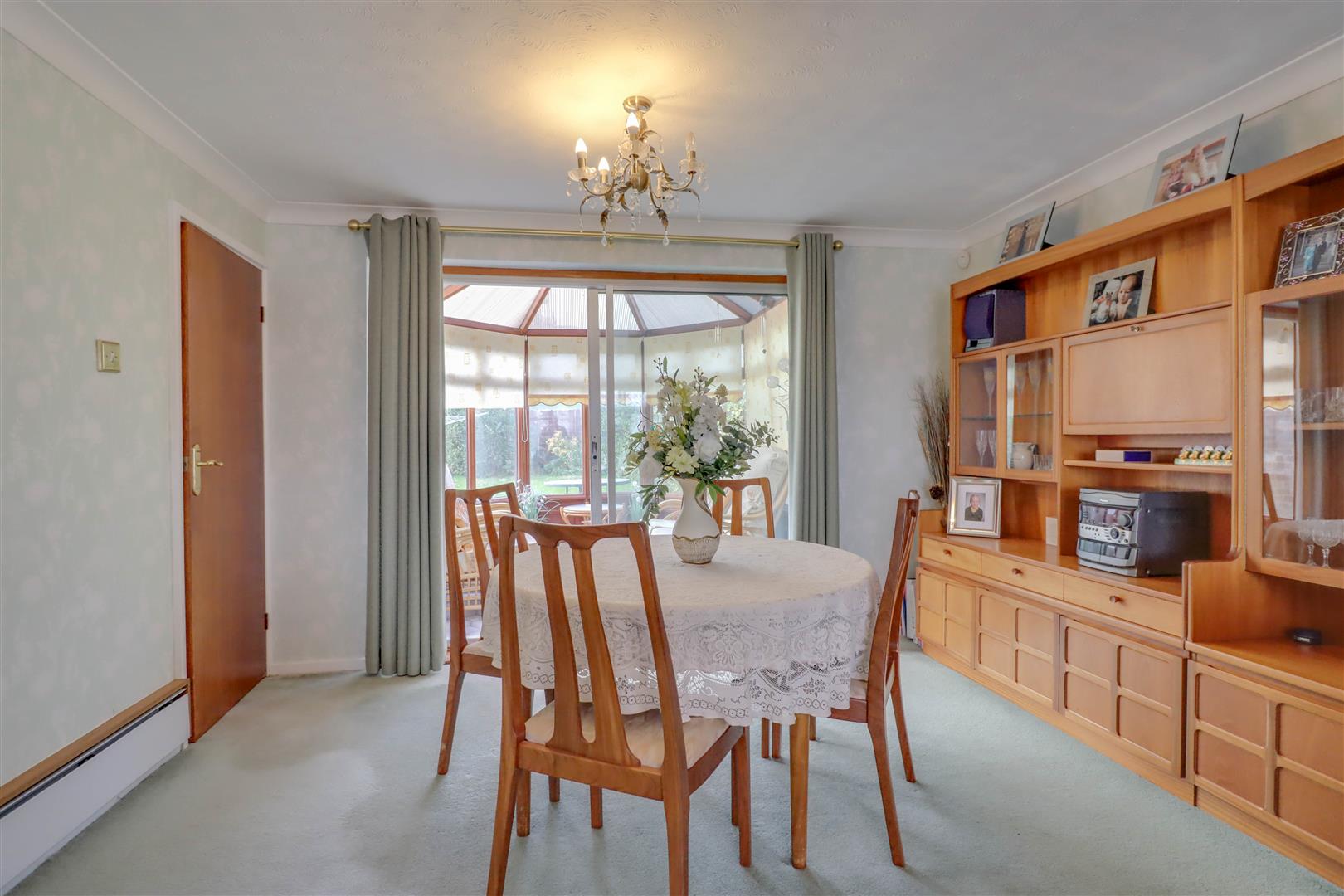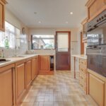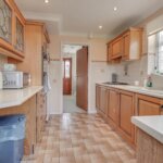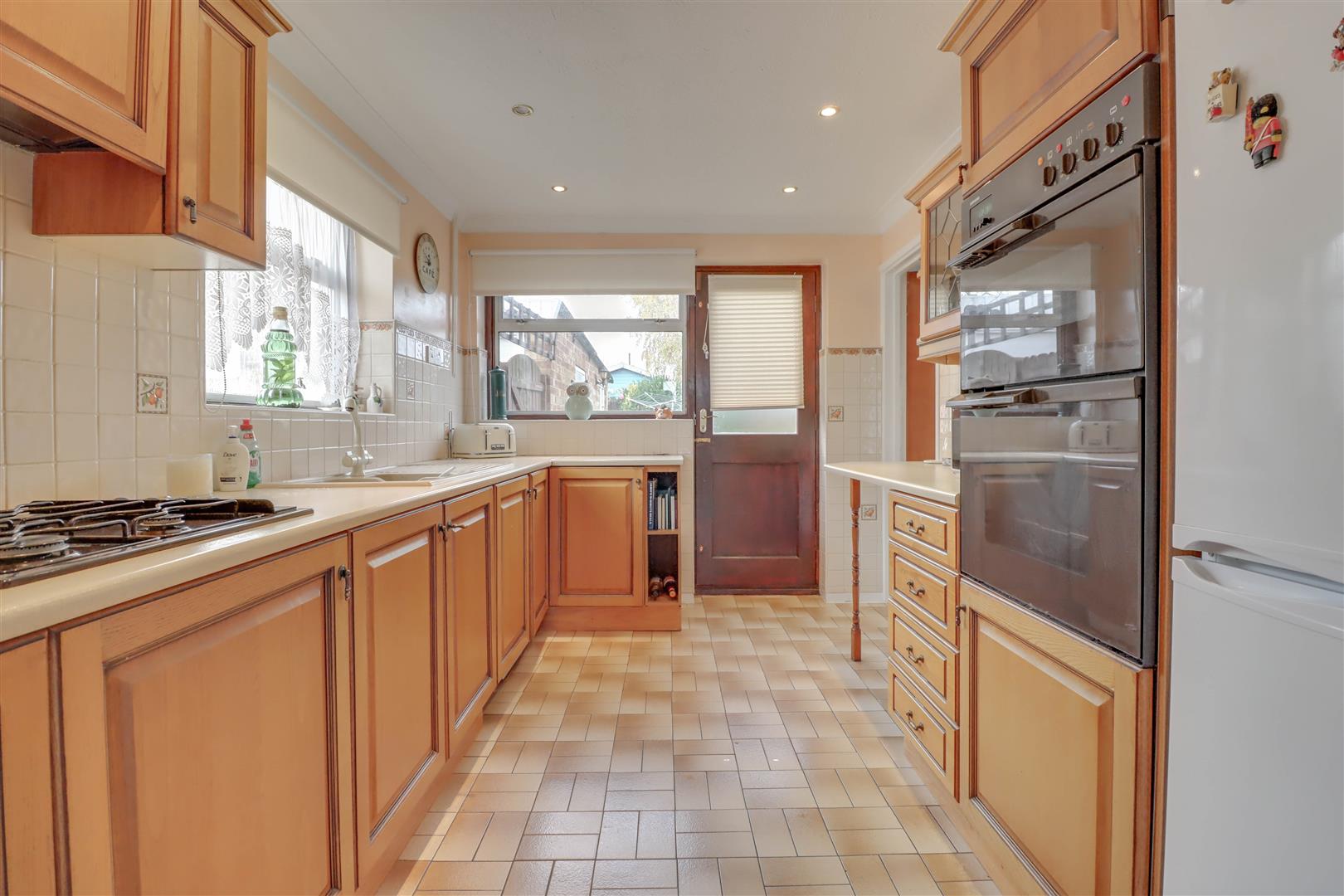 Double glazed windows to rear and side. Double glazed door to rear. Range of base and wall mounted units providing drawer and cupboard space with work top surface extending to incorporate inset sink unit with cupboard beneath. Breakfast bar. Space for appliances. Built in oven, grill and hob. Tiling to floor and surround. Coved ceiling. Glazed display cupboards. Radiator.