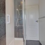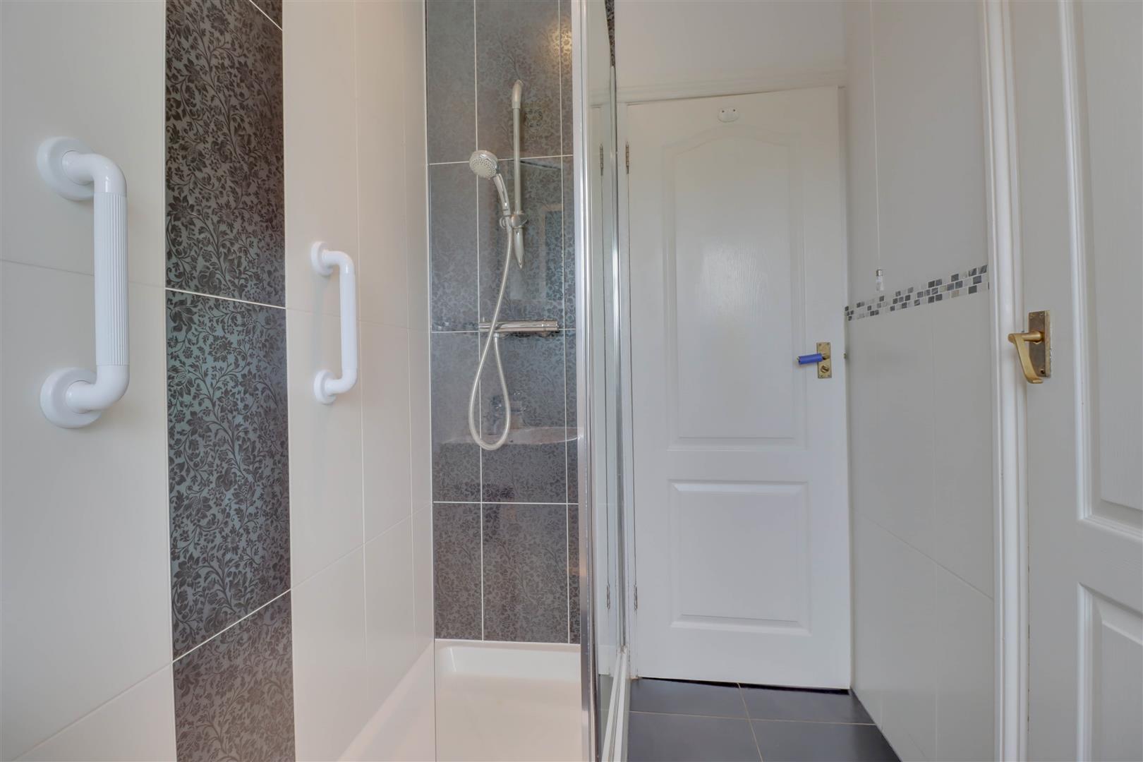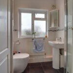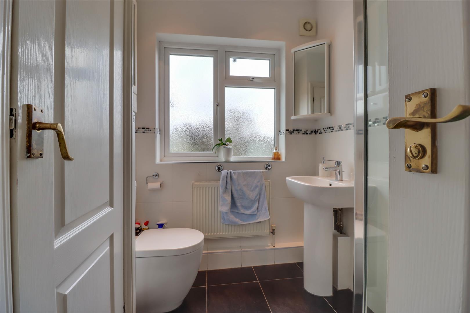 Double glazed opaque window to rear. Radiator. Suite comprising of low level WC, pedestal wash hand basin and shower cubicle. Tiling to floor and surround. Cupboard housing gas fired boiler.