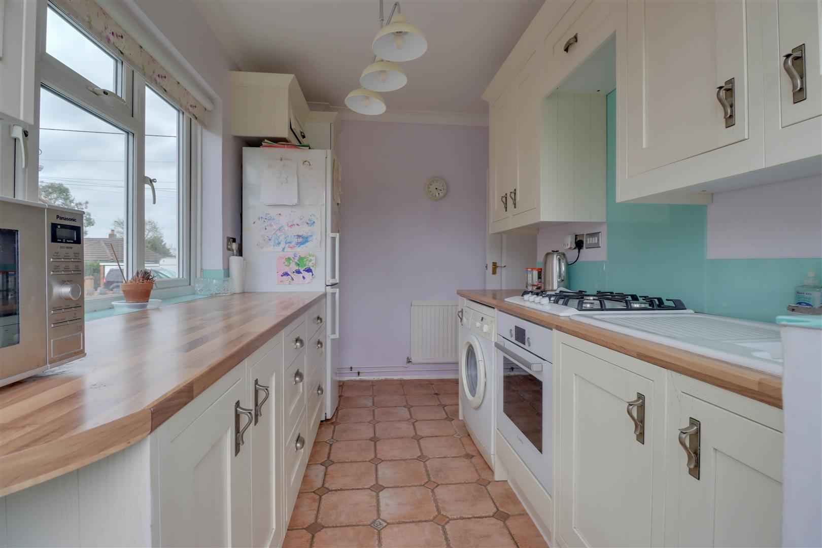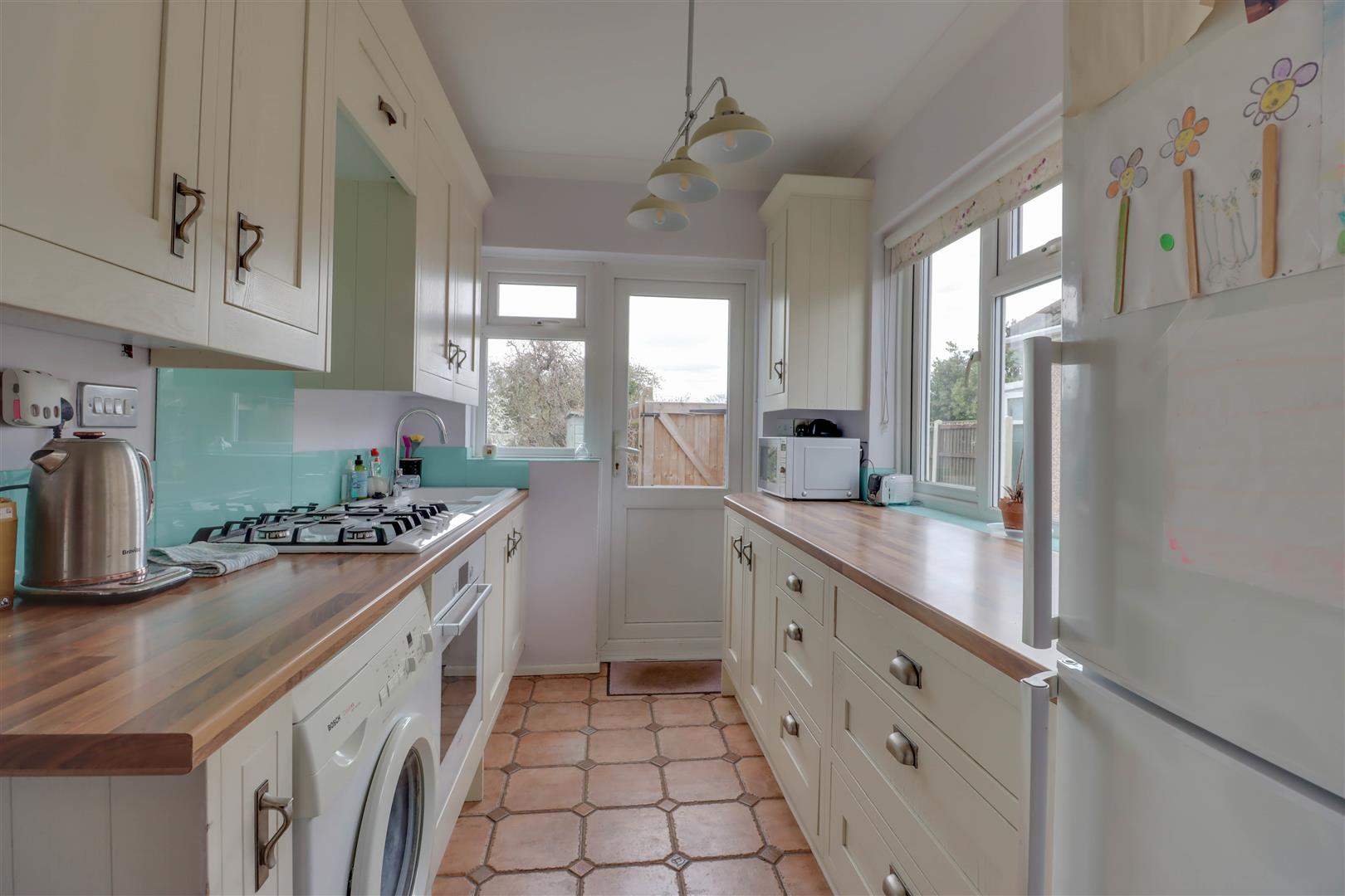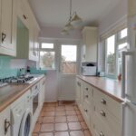 Double glazed windows to rear and side. Double glazed door to rear garden. Range of base and wall mounted units providing drawer and cupboard space with work top surface extending to incorporate inset sink unit with cupboard beneath. Built in oven and hob. Space for fridge freezer and washing machine. Radiator. Tiled surround.