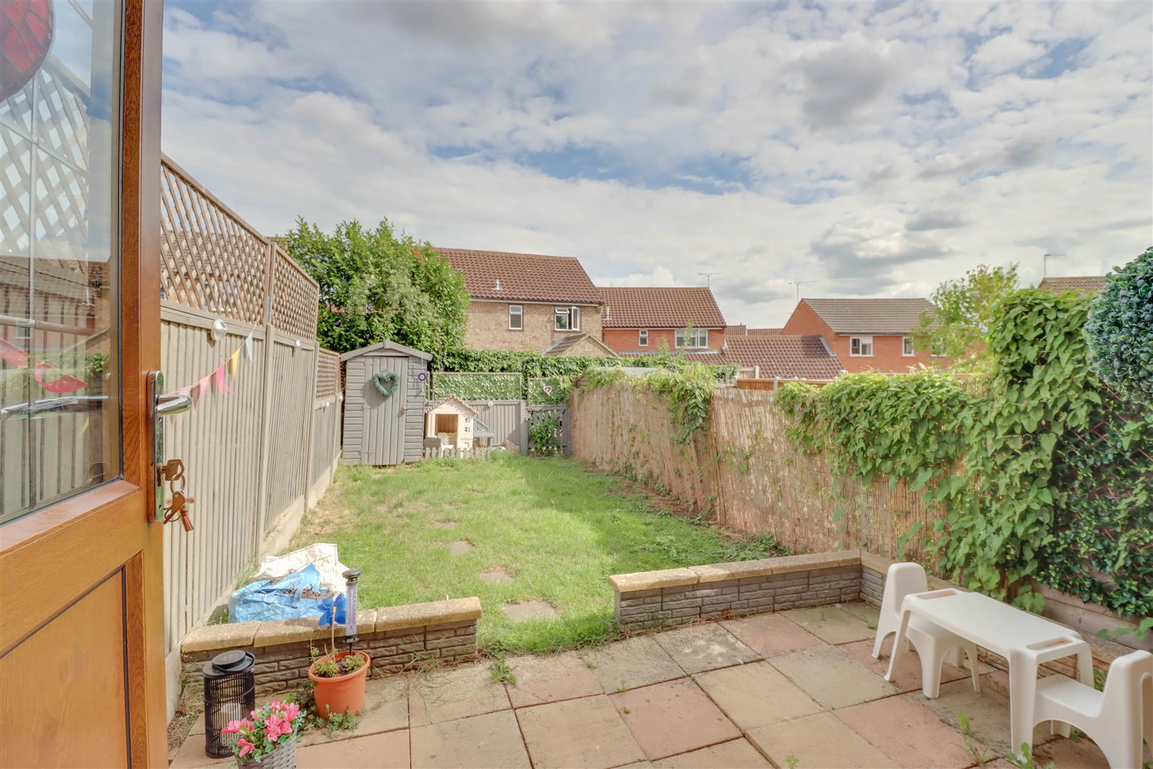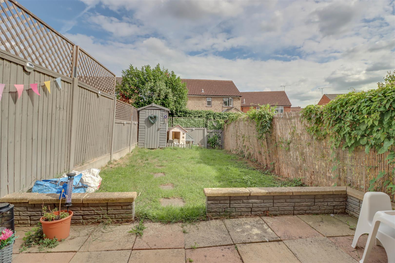Commencing with patio. Shed. Outside tap. Gate to rear. Path to: