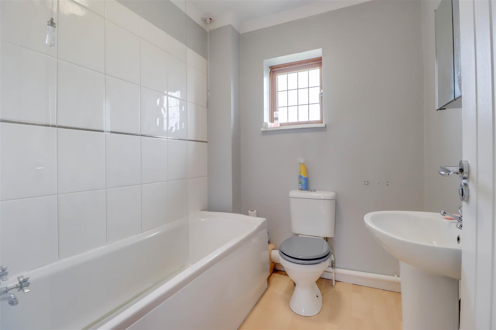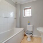 Double glazed opaque window to rear. Suite comprising of low level WC, wash hand basin and panel enclosed bath unit with shower and screen. Tiled surround. Radiator/rail.