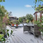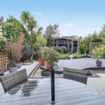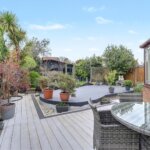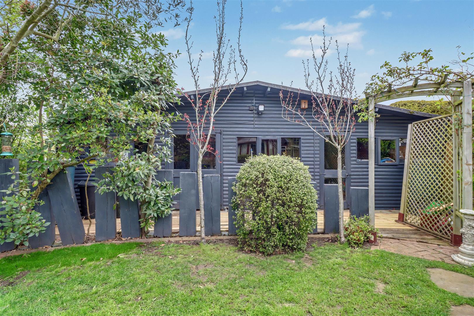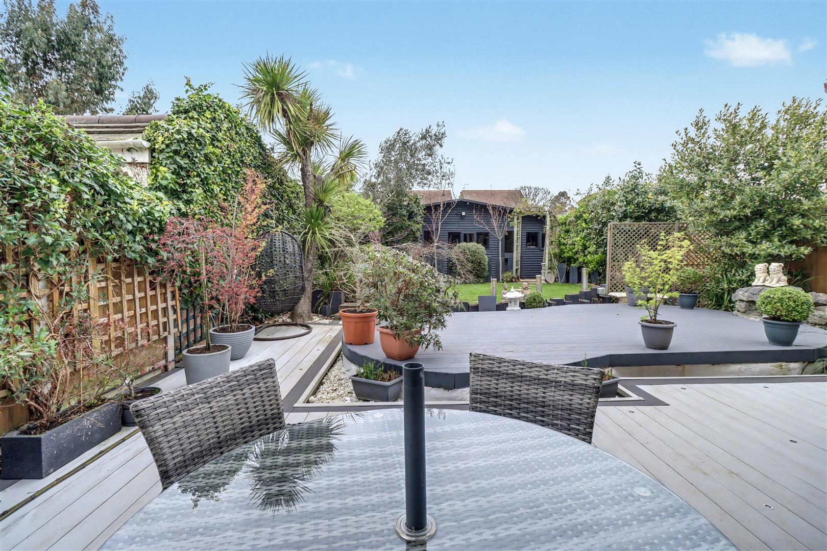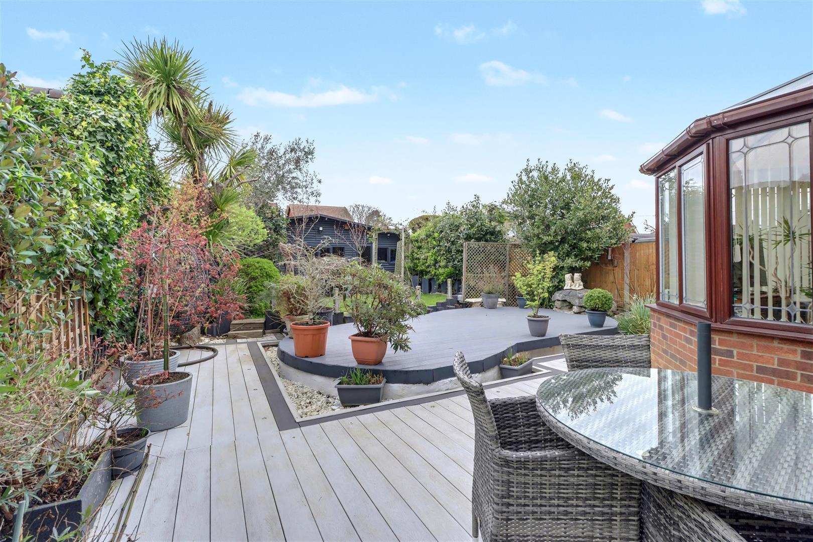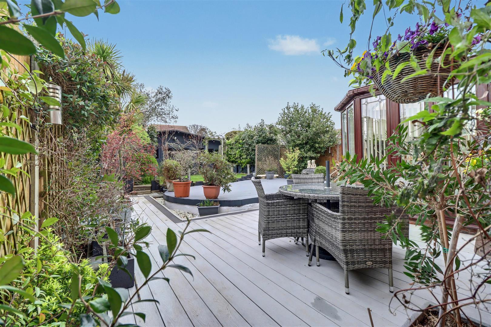 Comprising with composite decking with lighting with remainder laid to lawn with flower and shrub borders. Access to side with gate. Additional decked area with trellis arch to:
