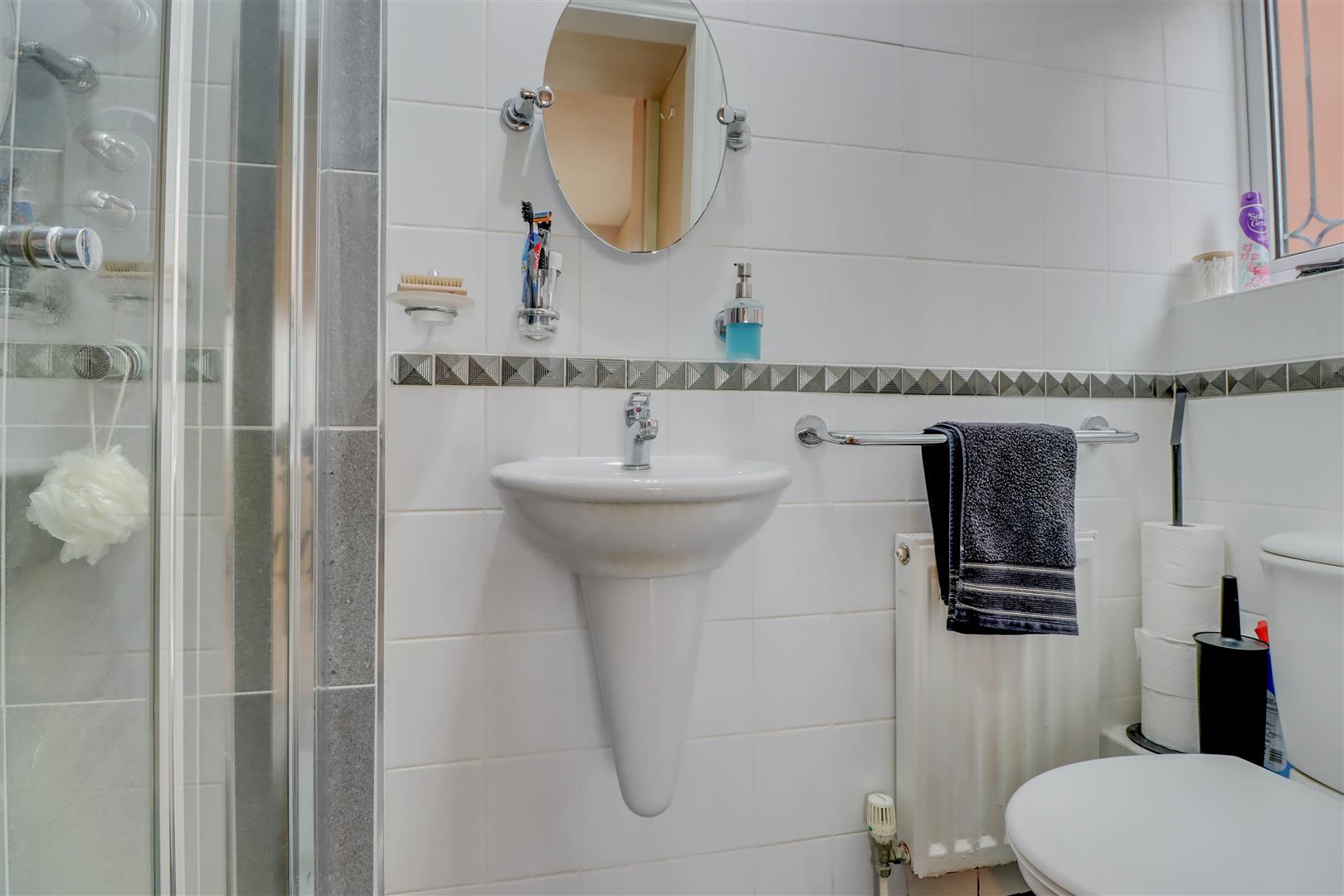 Double glazed opaque window to side. Suite comprising of low level WC, wash hand basin and shower cubicle. Extensive tiled surround.