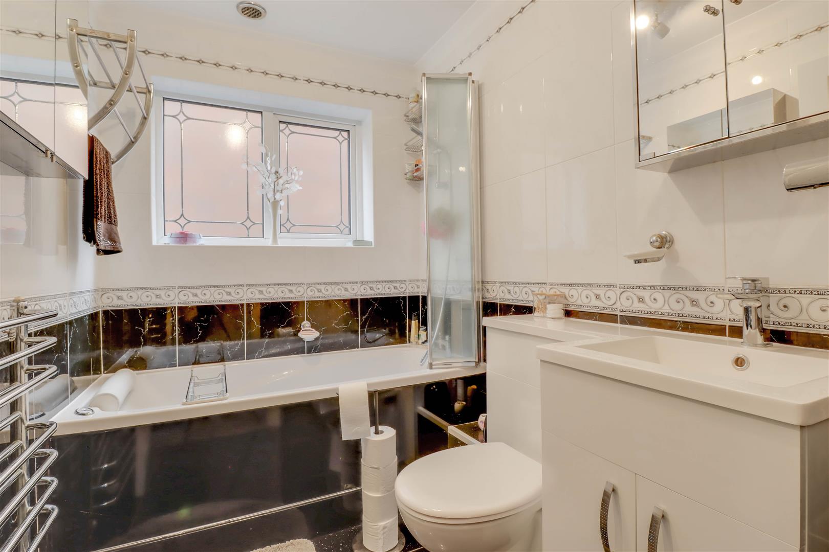 Double glazed opaque window to side. Suite comprising of low level WC, vanity wash hand basin and Jacuzzi bath with shower and screen. Radiator/rail.