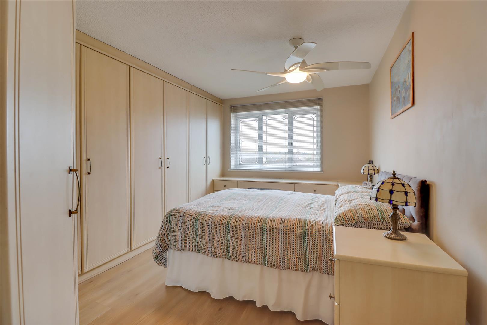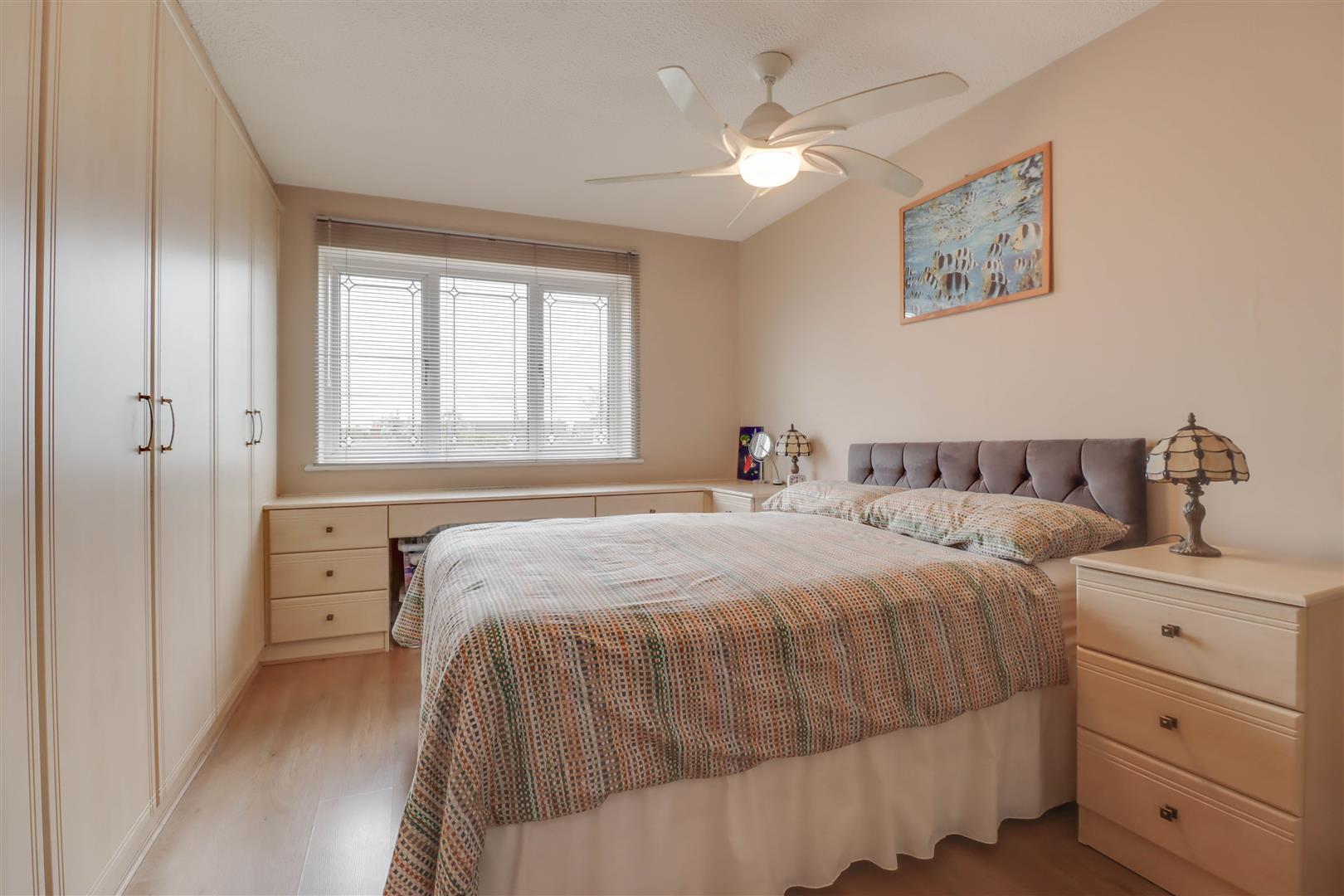 Double glazed window to front. Radiator. Range of fitted wardrobe cupboards, drawers and vanity unit. Ceiling fan. Concealed access to: