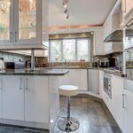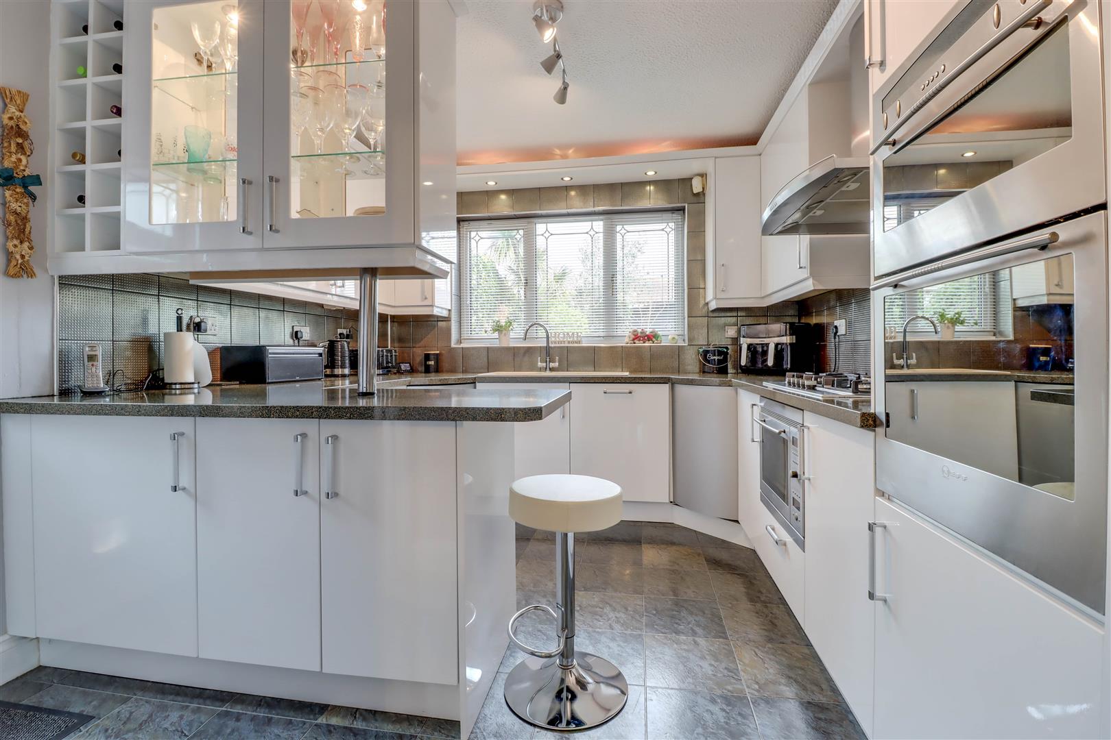 Double glazed window to rear. Double glazed door to side. Range of updated base and wall mounted units providing drawer and cupboard space with Quartz work top extending to incorporate inset sink unit. Peninsula unit and carousels. Integrated dishwasher. Built in oven, microwave and 5 ring hob with extractor fan above. Tiled surround. Radiator/rail. Amtico flooring extending to: