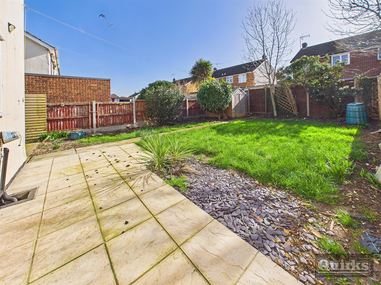 Paved patio to fore, mature borders and flower beds, side pedestrian access to front, shed, fenced to all boundaries