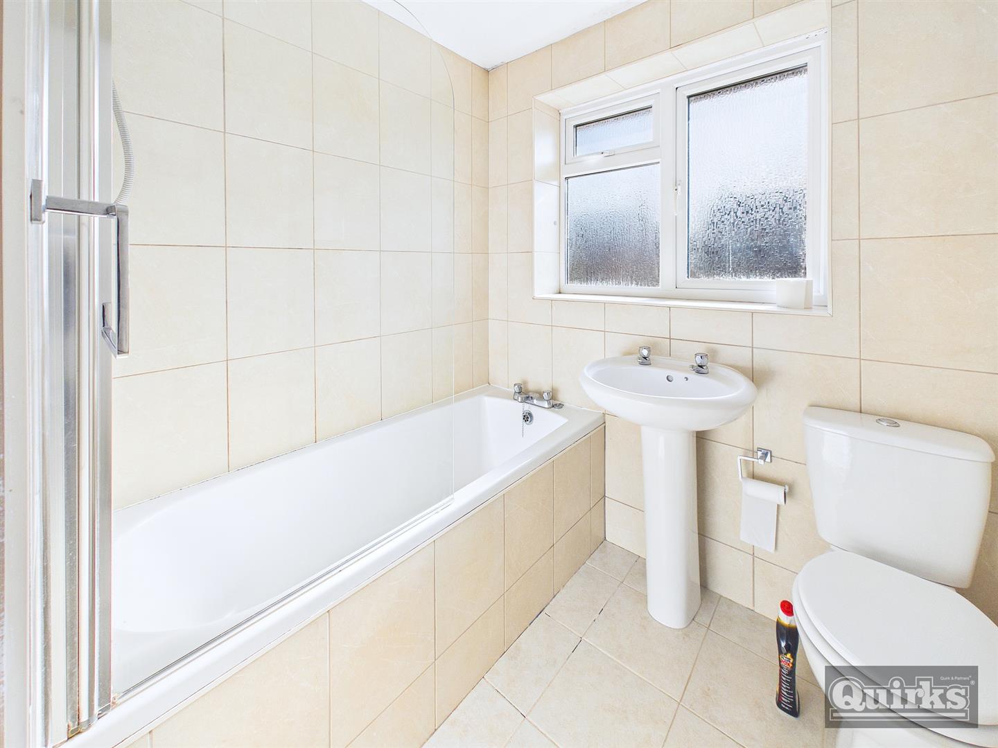 Double glazed window, tiling to walls, panelled bath with shower and screen over, low flush wc and pedestal wash hand basin