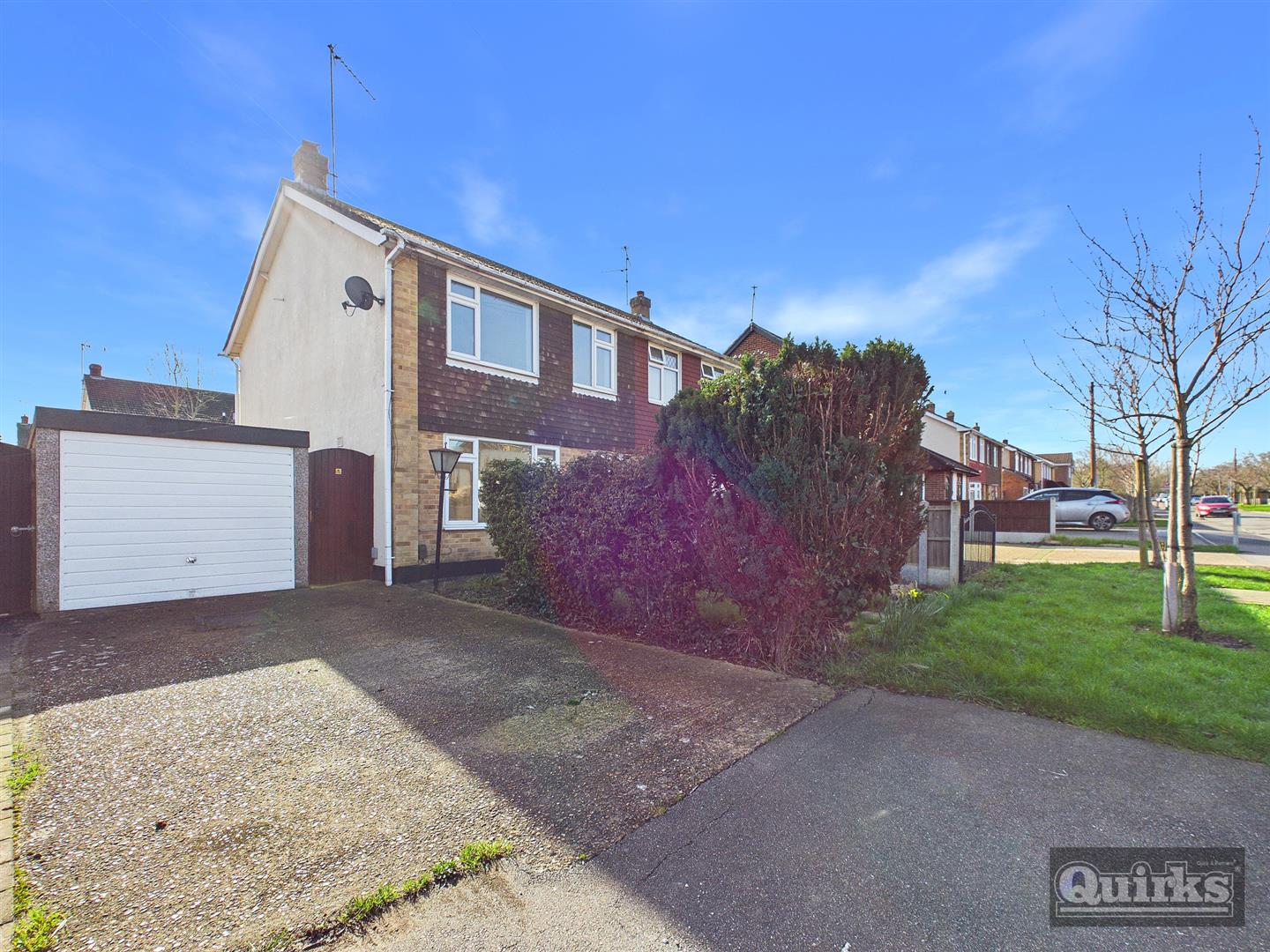 Lawn area, side access to garden, driveway offering off road parking in front of DETACHED GARAGE