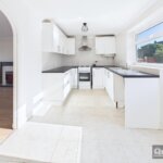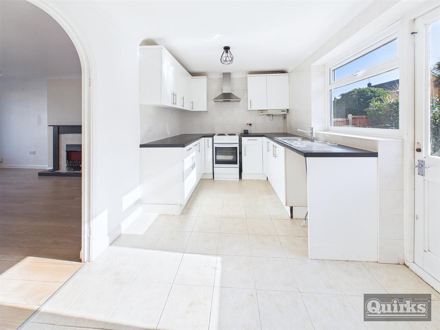 Door to rear garden, double glazed window alongside, modern white high gloss units to both ground and eye level, complimentary roll edged worksurfaces with inset sink unit with drainer and mixer tap, space for cooker with cooker hood over, tiled floor and tiled splash back