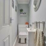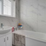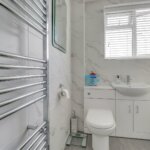 Suite comprising of low level WC and vanity wash hand basin. Tiled surround. Coved ceiling.
