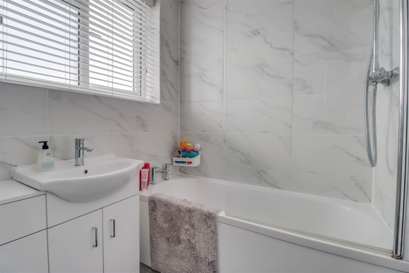 Double glazed opaque window to side. Suite comprising of low level WC, vanity wash hand basin and panel enclosed bath unit with shower and screen. Extensive tiled surround. Radiator/rail.
