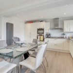 Two double glazed window to front. Double glazed window to side. Range of refitted base and wall mounted units providing drawer and cupboard space with work top surface extending to incorporate inset sink unit. Integrated dishwasher, washer/dryer and fridge freezer. Built in oven, grill, microwave, hob and extractor fan above. Coved ceiling with spotlights. Upright radiator.