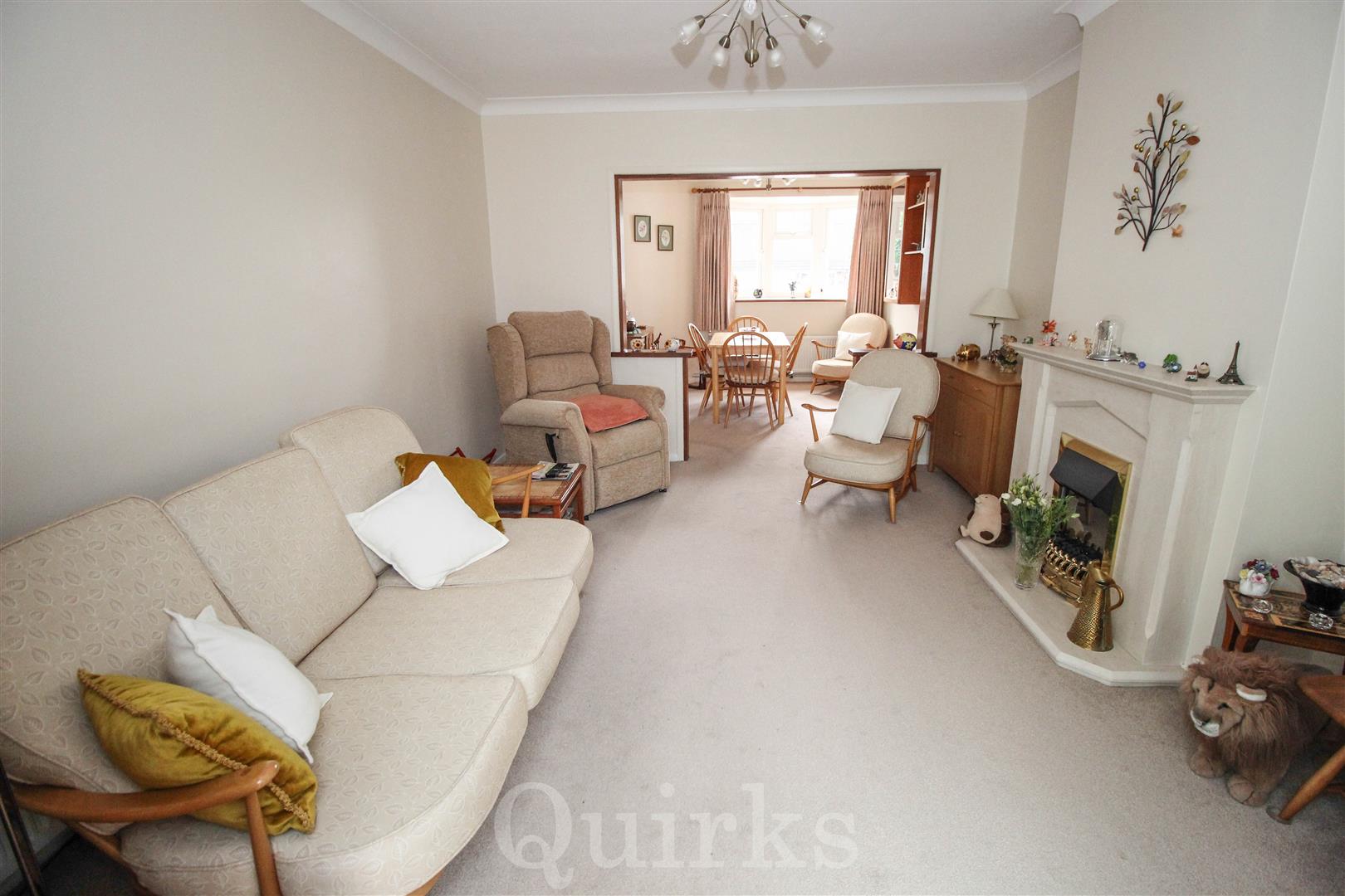 WELL PRESENTED TWO BEDROOM SEMI-DETACHED BUNGALOW, IN THE SOUGHT AFTER QUILTERS AREA. Entrance hall with double glazed entrance door, radiator and loft access. to the left hand side is a dining area with double glazed bow window to front, radiator and opening into the lounge with French doors onto Conservatory having French Doors onto the rear garden.. The well fitted kitchen has a range of eye and base level units with work surface over incorporating sink unit with mixer tap, integrated fridge and separate integrated freezer, built in Neff electric oven with four ring Neff gas hob and extractor fan over, integrated dishwasher, cupboard with plumbing for washing machine, cupboard housing boiler and vinyl flooring. To the right hand side of the property are two bedrooms with double glazed windows and a shower room. Externally the front garden is lawned with a pathway leading to the entrance door. To the side of the property there is a driveway leading to a detached garage. The rear garden commences with a paved patio with the remainder mostly laid to lawn.