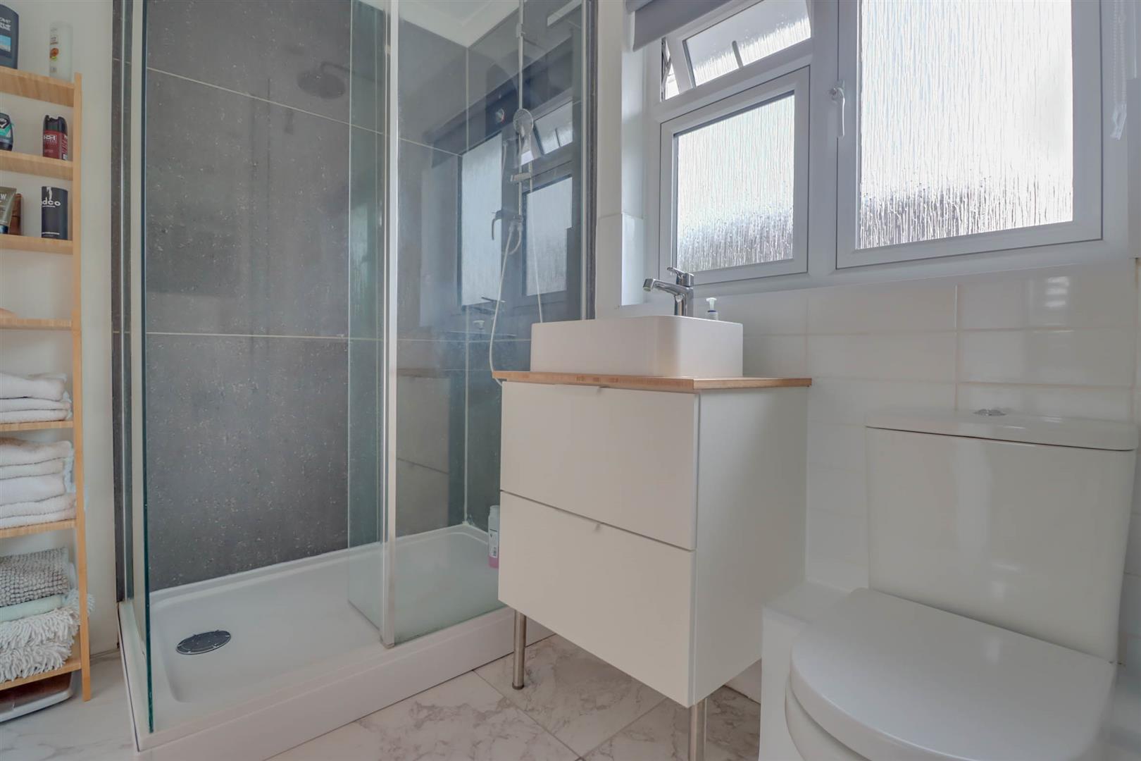 Double glazed opaque window to rear. Refitted suite comprising of enclosed low level WC, vanity wash hand basin and shower cubicle. Part tiling to walls and tiling to floor. Radiator (untested).