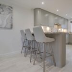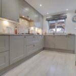 Base and wall mounted units providing drawer and cupboard space with Quartz work tops extending to incorporate sink unit. Integrated fridge. Amtico finish to floor.