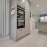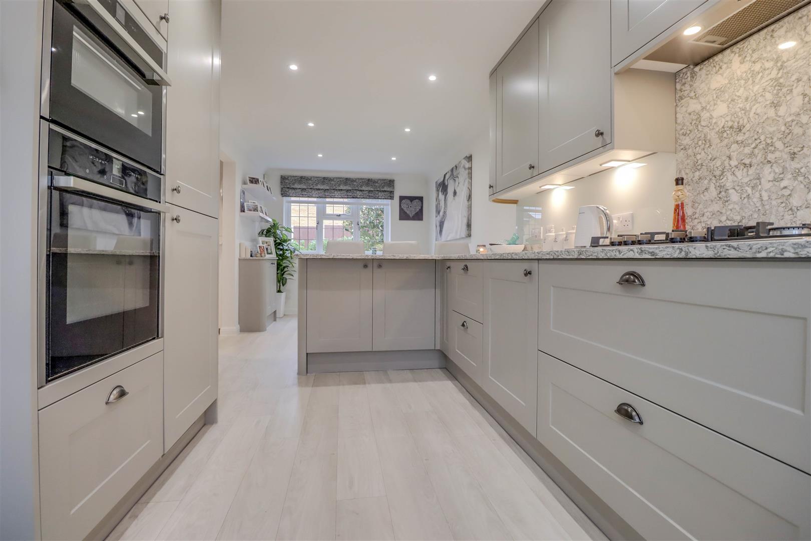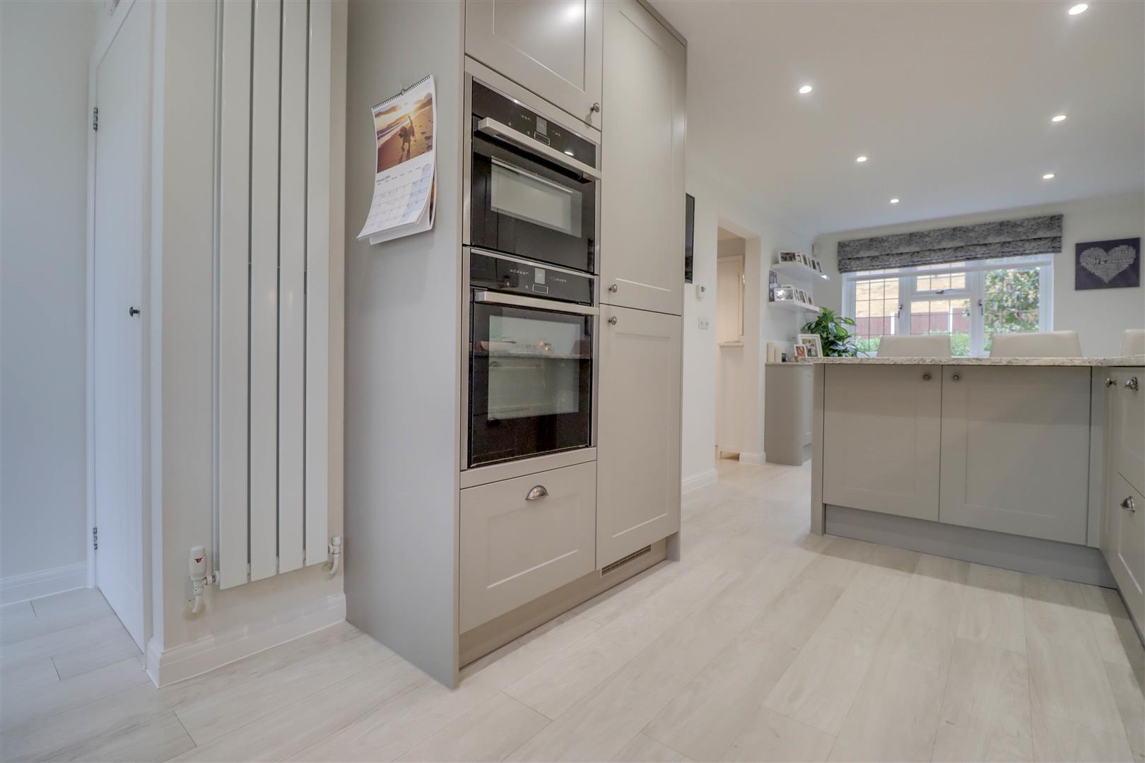 Double glazed windows to front and rear. Double glazed door to rear garden. 2 x Radiators. Range of base and wall mounted units providing drawer and cupboard space with Quartz work top surface extending to incorporate inset sink unit with cupboard beneath. Breakfast bar. Integrated fridge freezer, dishwasher and washing machine. Built in oven, hob, microwave/oven, 5 ring hob and extractor fan. Understairs cupboard. Coved ceiling with downlighters. Amtico finish to floor.