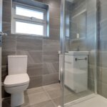 Suite comprising of low level WC, vanity wash hand basin and shower cubicle. Extractor fan. Chrome radiator/rail.