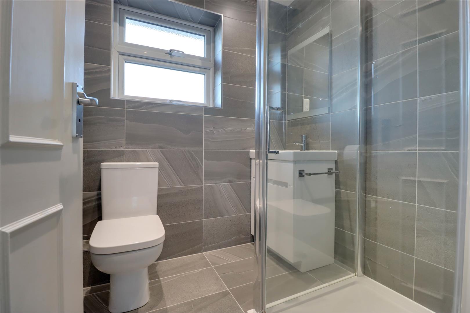 Double glazed opaque window to front. Suite comprising of low level WC and vanity wash hand basin. Radiator. Tiling to floor and surround. Extractor fan.