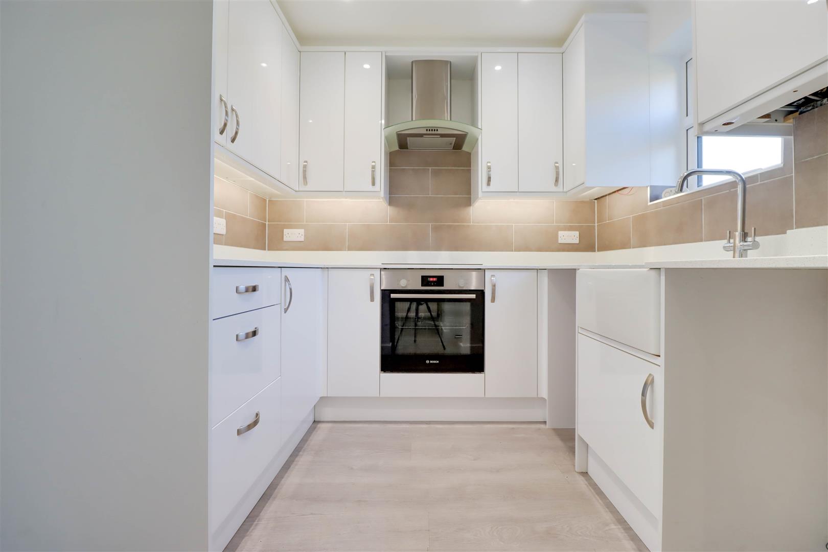Double glazed window to front. Range of base and wall mounted units providing drawer and cupboard space with Quartz worktops extending to incorporate inset Butler sink. Built in oven, hob and extractor fan above. Space for washing machine, dishwasher and fridge freezer. Downlighters to ceiling. Tiled surround.