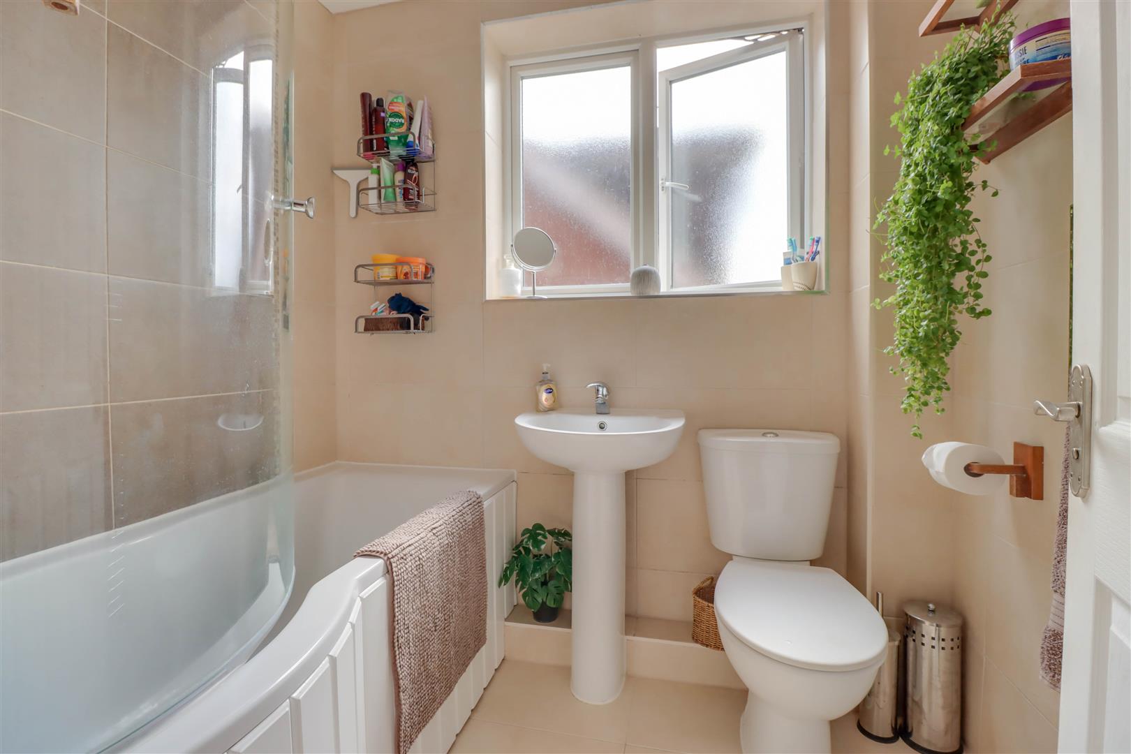 Double glazed opaque window to side. Suite comprising of low level WC, pedestal wash hand basin and panel enclosed bath unit. Radiator/rail. Extensive tiling to walls and floor. Downlighters to ceiling.