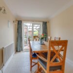 Double glazed French doors to rear garden. Double glazed window to side. Range of base and wall mounted units providing drawer and cupboard space with work top surface extending to incorporate inset sink unit. Integrated dishwasher, fridge freezer and washing machine. Space for Range style cooker. Tiling to floor and surround. Extractor fan. Radiator.