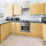 Double glazed window to front, extensive range of units to both ground and eye level with complimentary roll edge work surfaces, wood effect tiling to floor and tiled splash backs, space for washing machine and fridge freezer, sink unit with drainer and mixer tap, built in oven and hob with cooker hood over