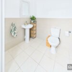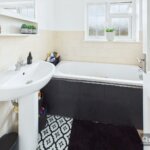 Double glazed opaque window to rear. Suite comprising of low level WC, wash hand basin and panel enclosed bath unit. Tiling to floor and walls. Radiator. Downlighters to ceiling. Vanity cupboards.