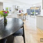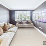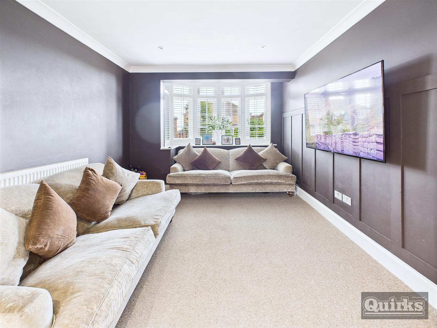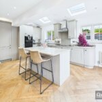 Double glazed bi-folding doors to side. Two double glazed windows to rear. Semi vaulted ceiling with dual skylights. Range of base and wall mounted units providing drawer and cupboard space with Quartz work top surfaces extending to incorporate inset sink unit. Island unit. Integrated dishwasher, fridge freezer, wine fridge, Cupboards housing space for washing machine and tumble dryer. Cupboard housing boiler. Wood veneer flooring. Radiator. Downlighters to ceiling.