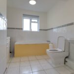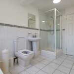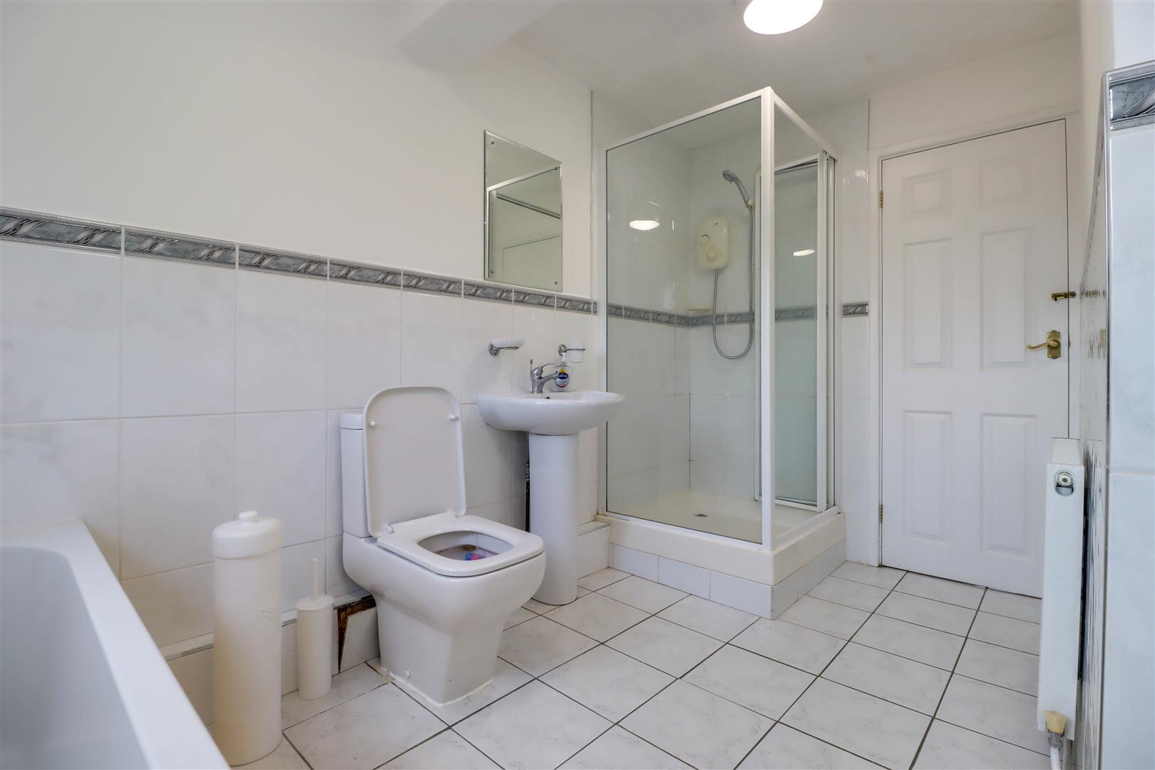 Double glazed opaque window, FOUR piece suite comprising shower cubicle, panelled bath, low flush wc and pedestal wash hand basin, radiator, half tiled walls