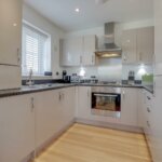 Double glazed window to rear. Range of base and wall mounted units providing drawer and cupboard space with work top surface extending to incorporate inset sink unit with cupboard beneath. Integrated fridge freezer, washing machine. Cupboard housing gas fired boiler. Space for dishwasher. Built in oven, hob and extractor fan above. Downlighters to ceiling.