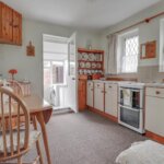 Two double glazed windows to side. Range of base and wall mounted units providing drawer and cupboard space with work top surface extending to incorporate inset sink unit with cupboard beneath.