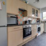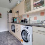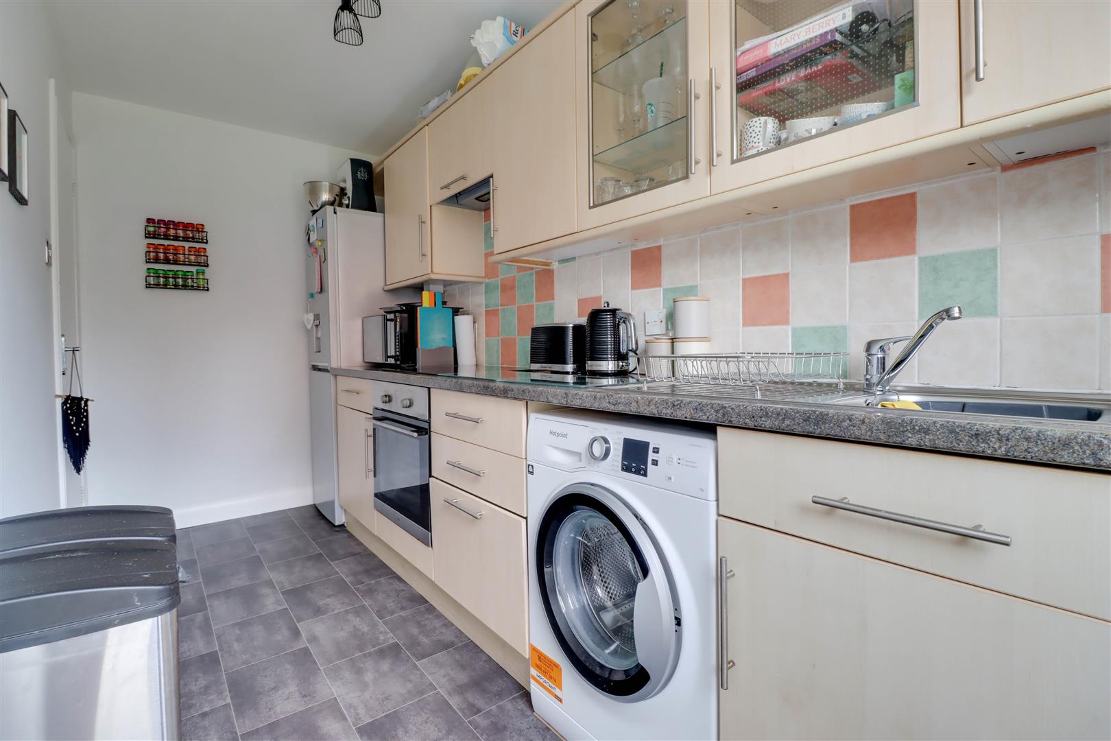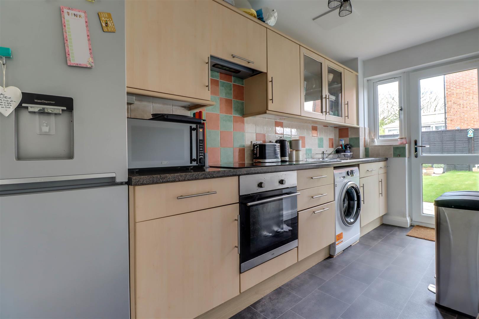 Double glazed window and double glazed door to rear garden. Range of base and wall mounted units providing drawer and cupboard space with work top surface extending to incorporate inset sink unit with cupboard beneath. Built in oven, hob and extractor fan. Space for fridge freezer and washing machine. Tiled surround.