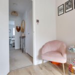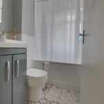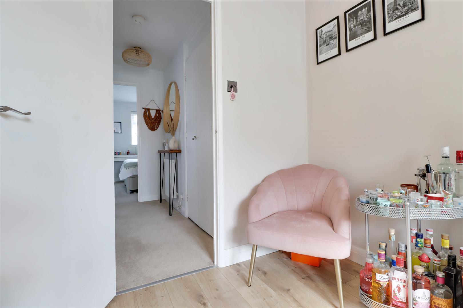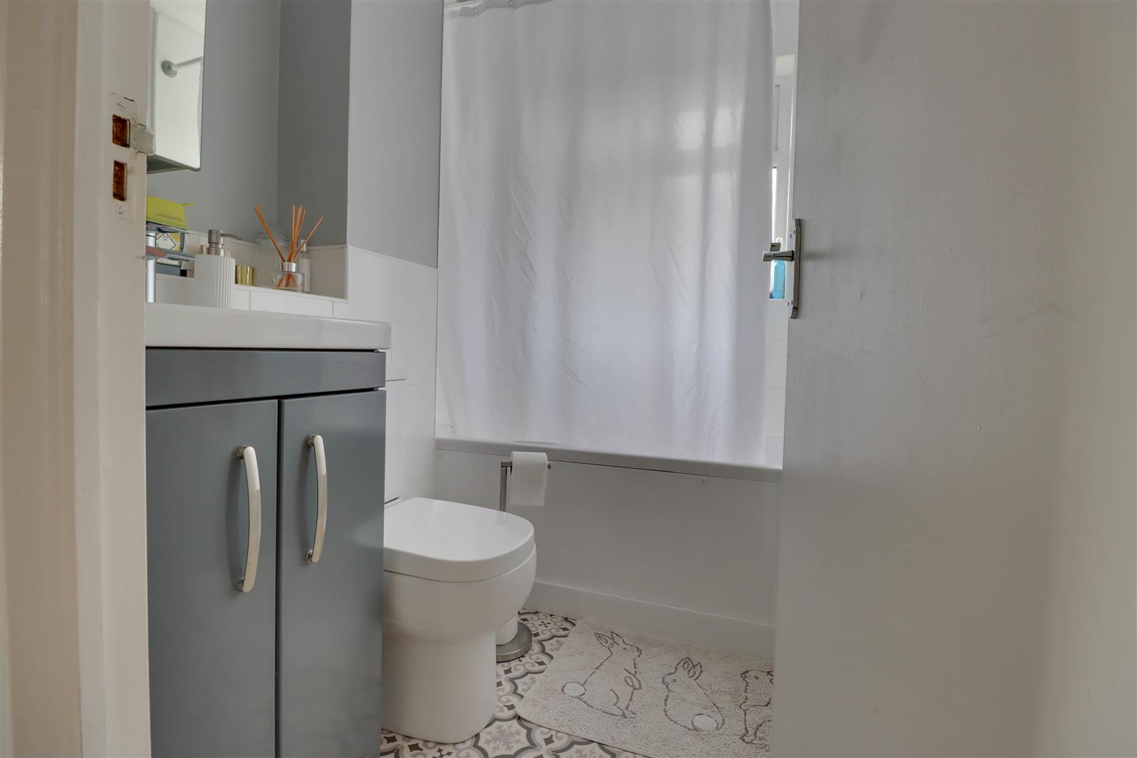 Double glazed opaque window to side. Suite comprising of low level WC, vanity wash hand basin and panel enclosed bath unit with shower and rail. Tiled surround.